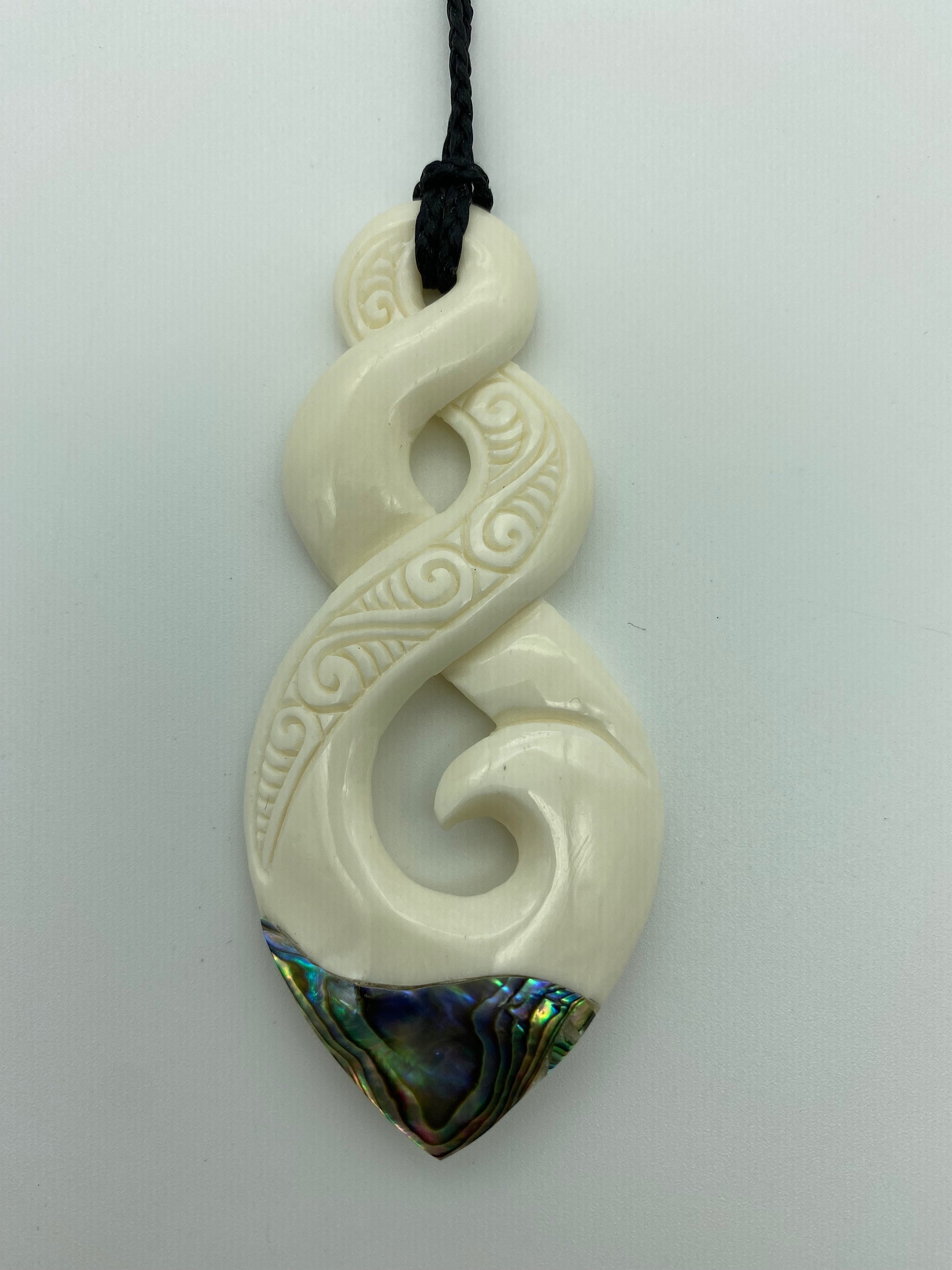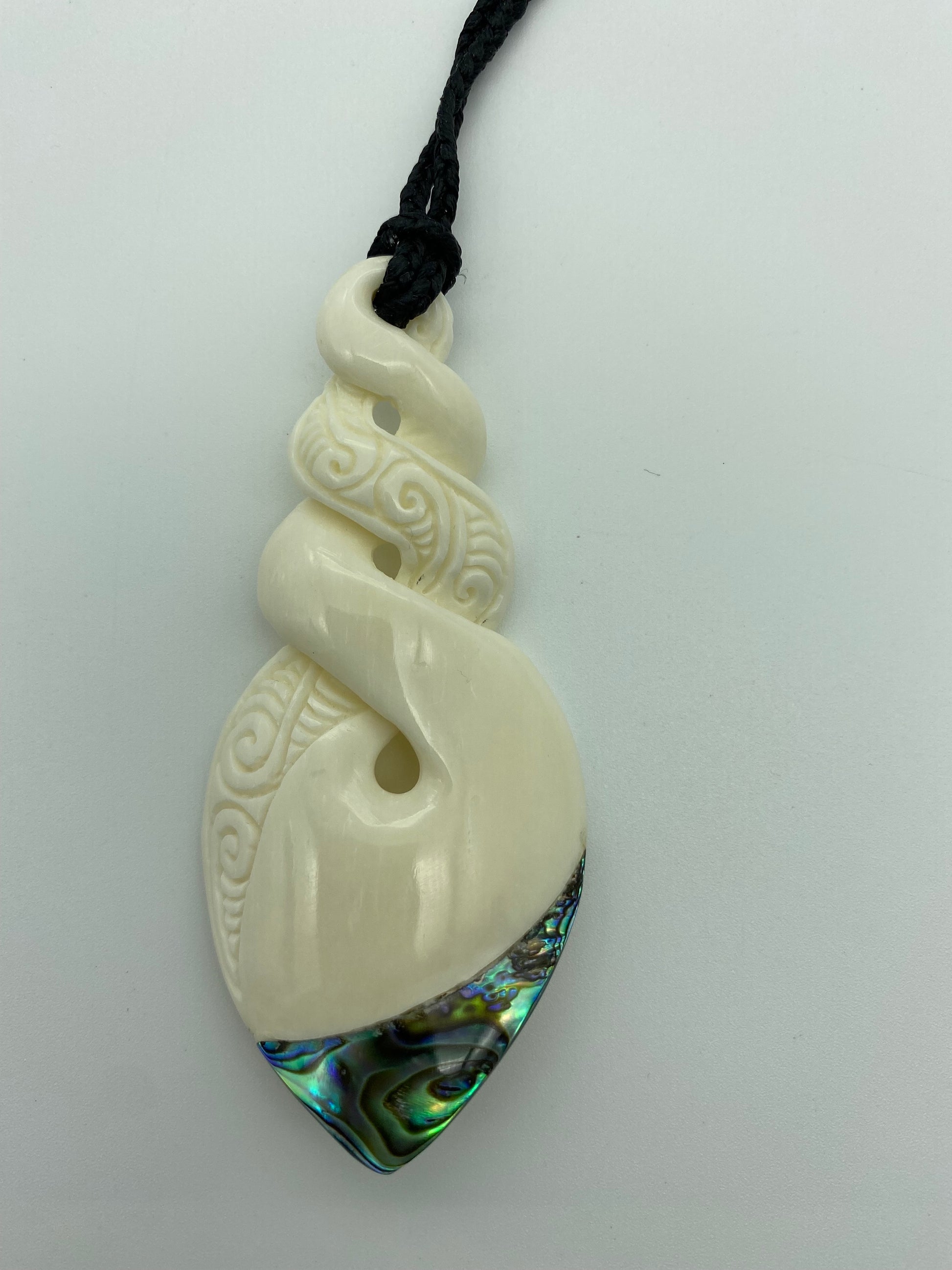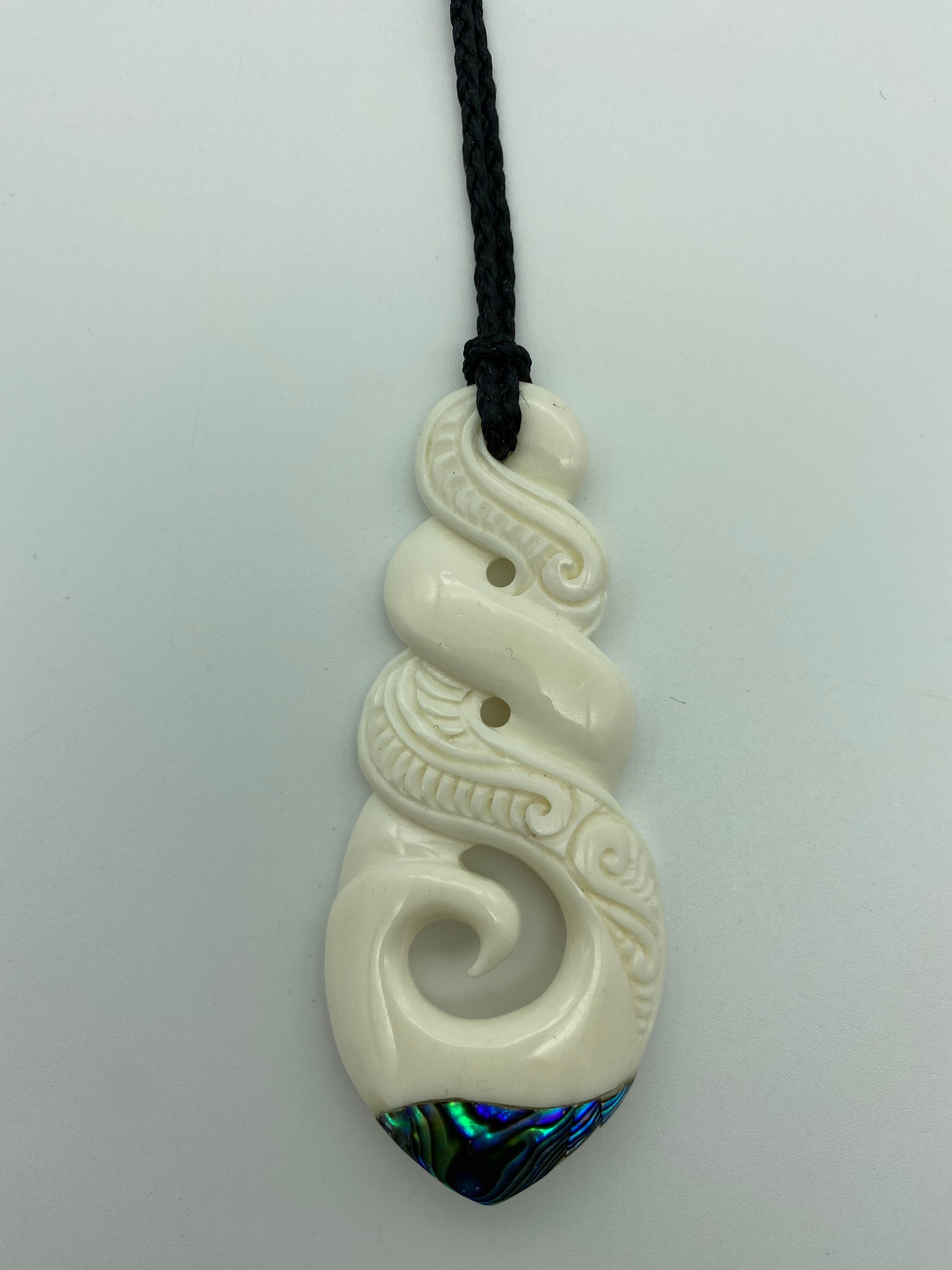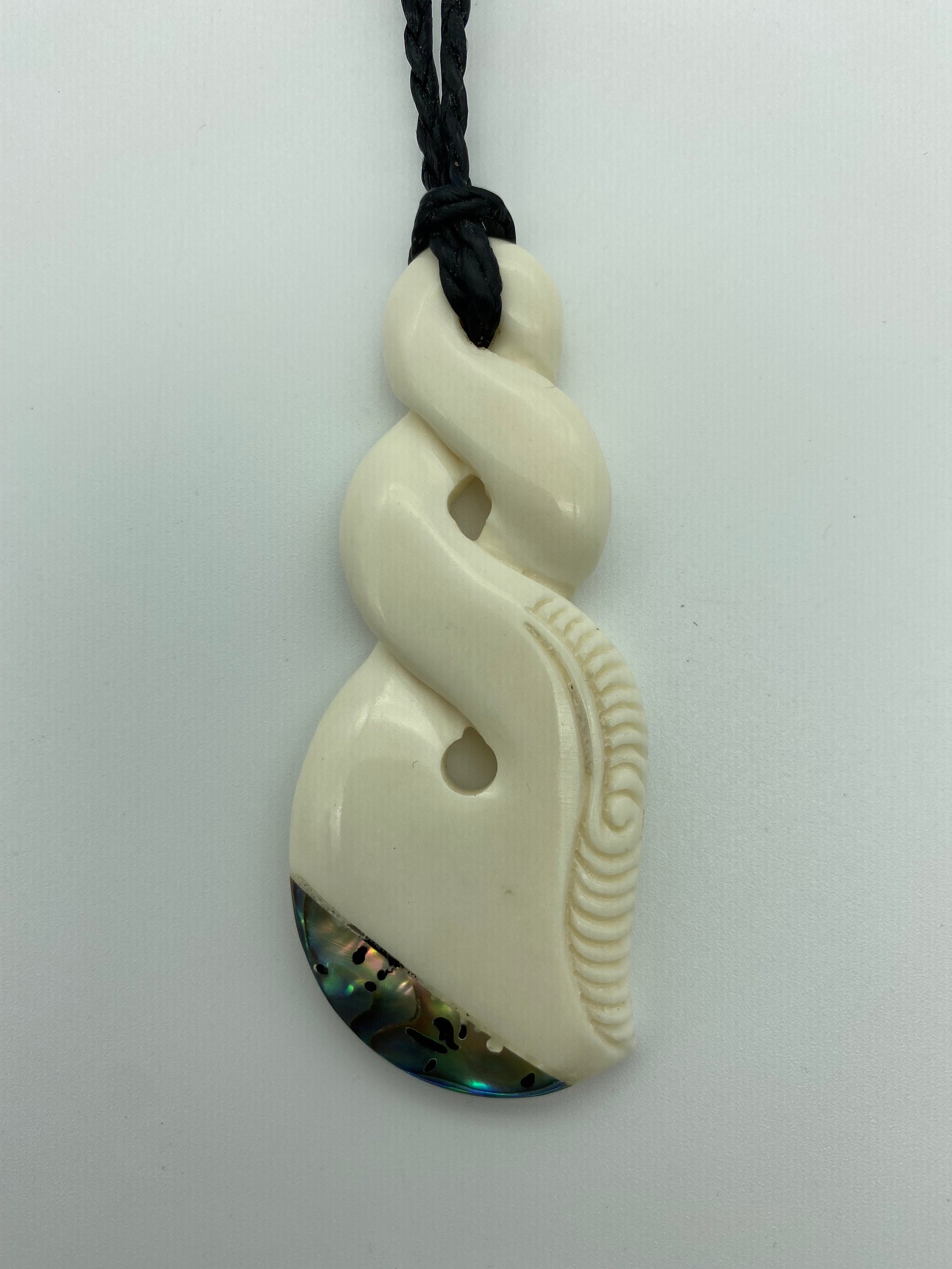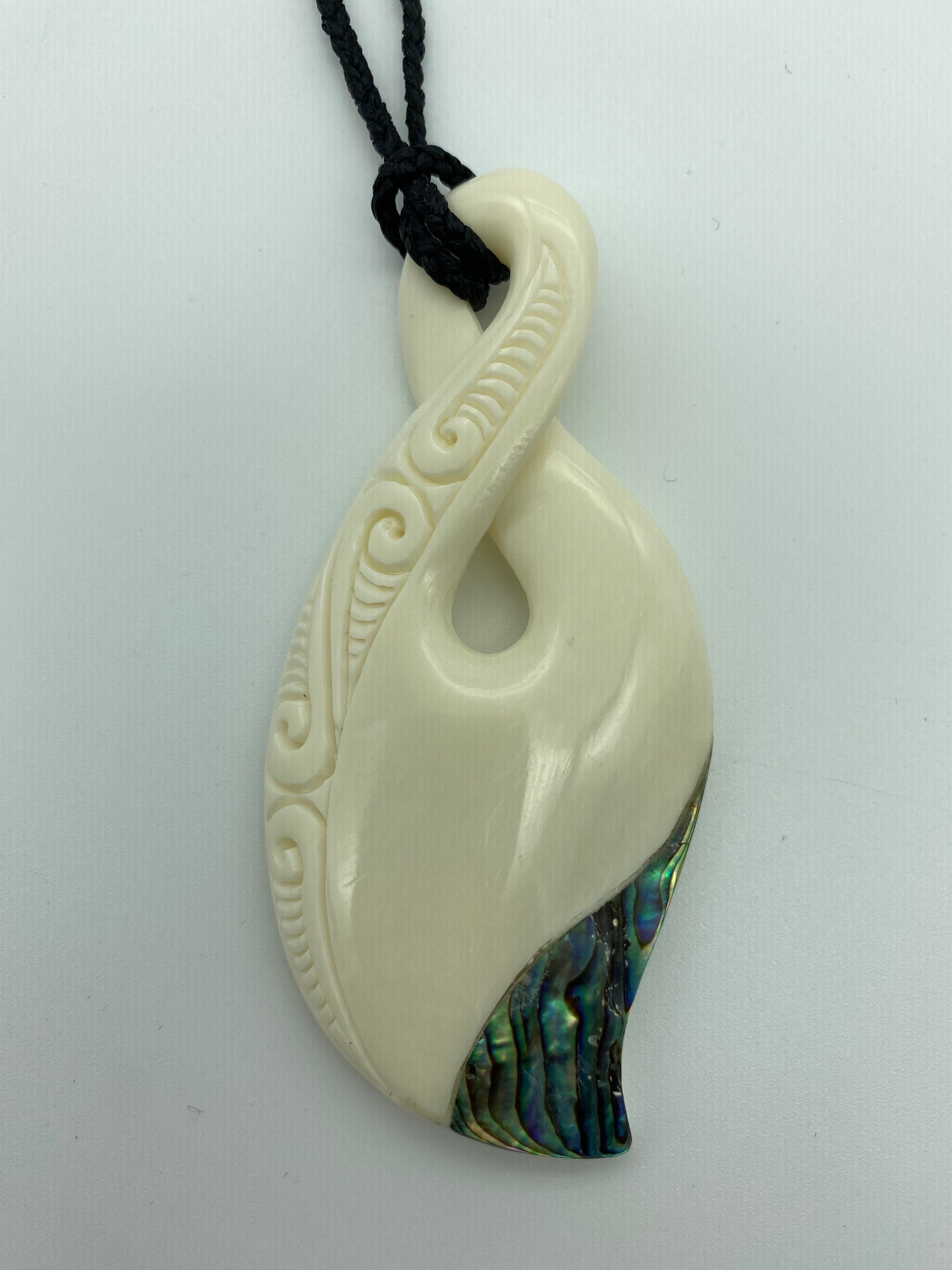 This beautiful bone Pikorua is a perfect combination of traditional Maori craftsmanship and modern touches. Hand-etched with intricate designs and featuring paua shell inlay, it is a treasured piece of art that reflects the culture and values of Aotearoa.