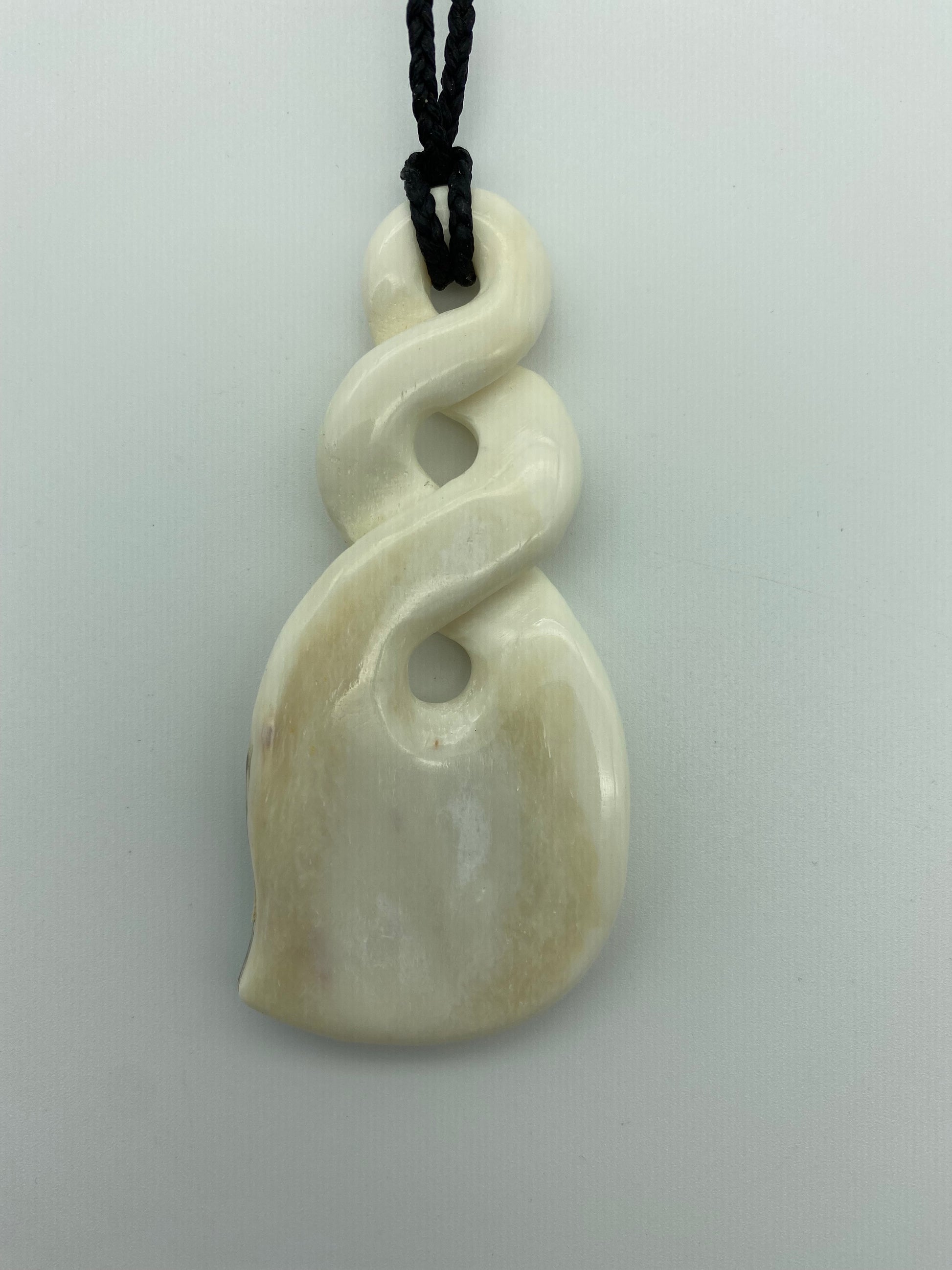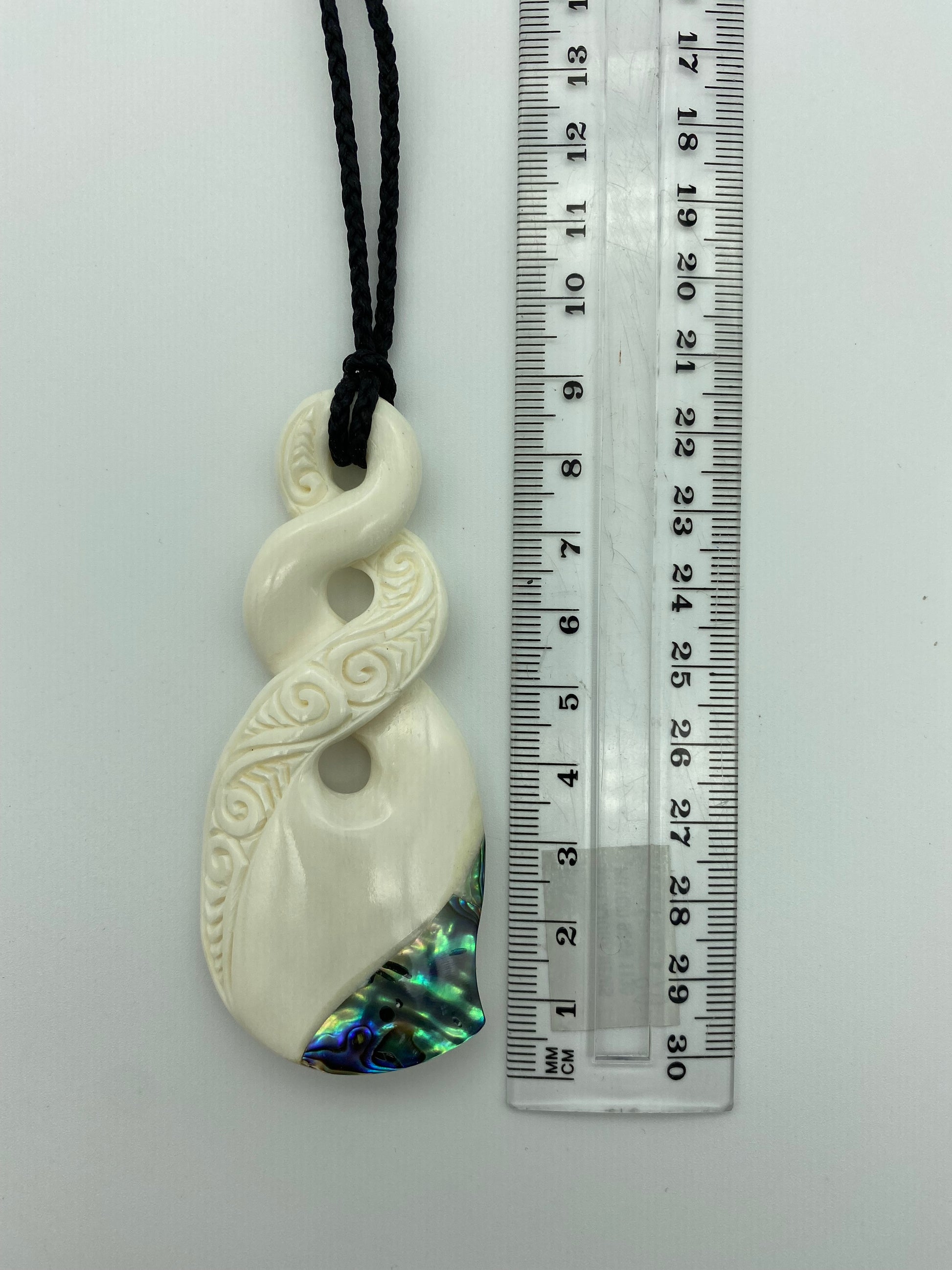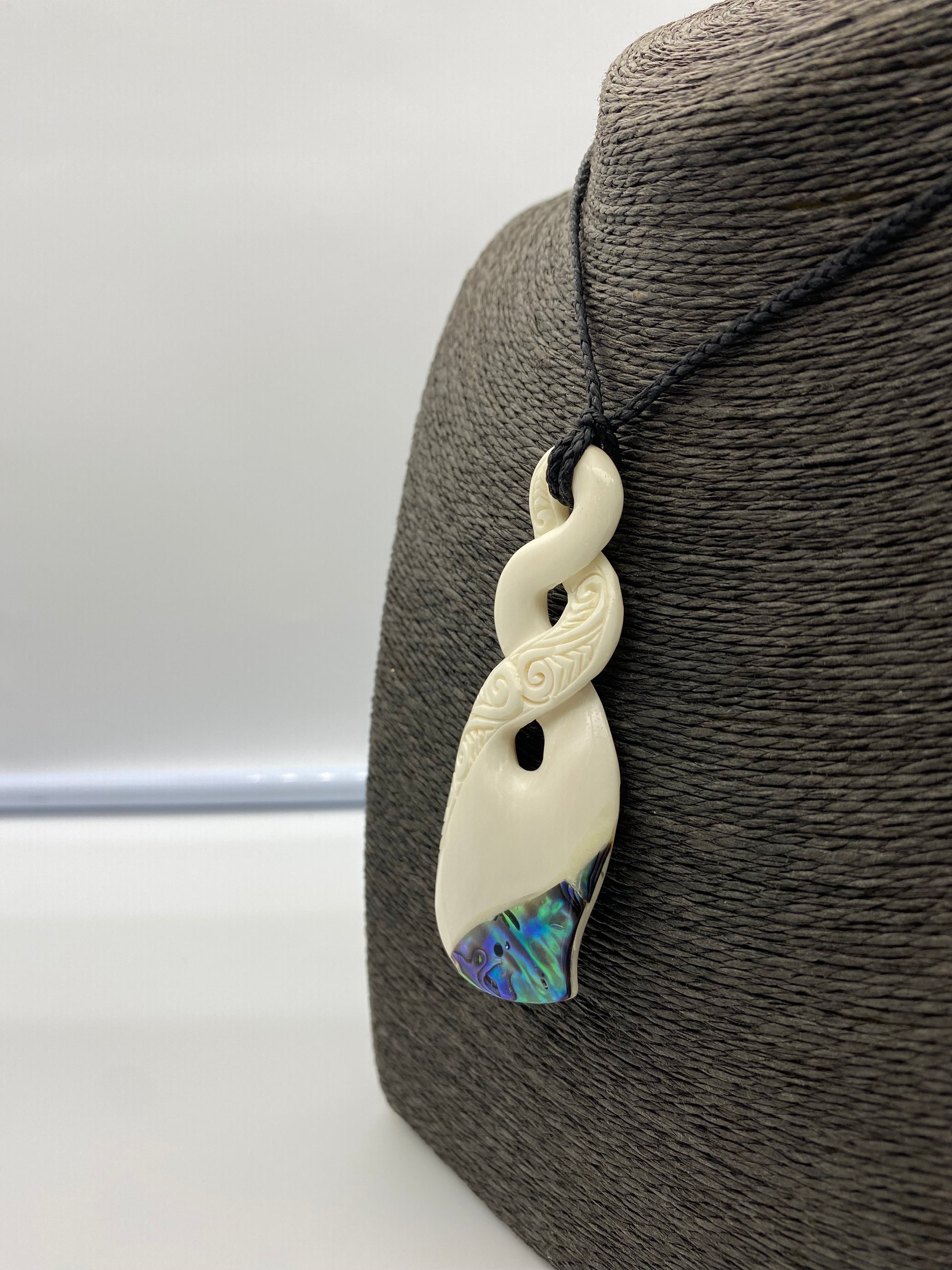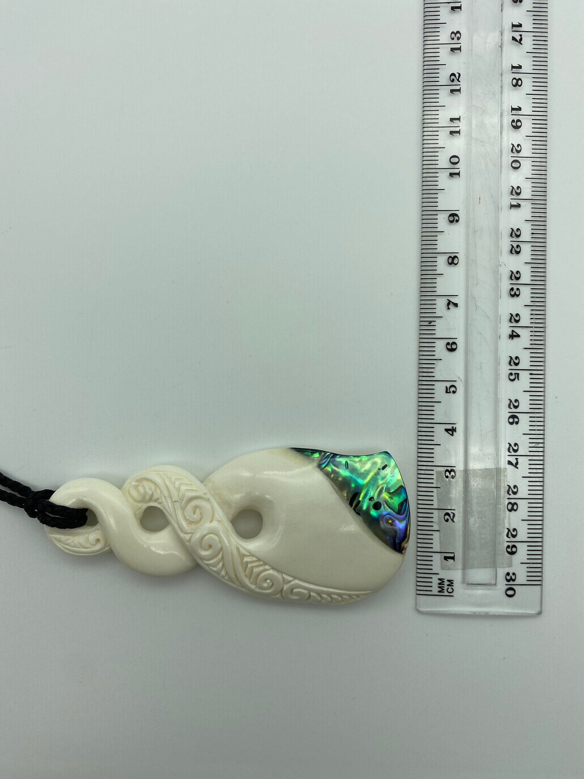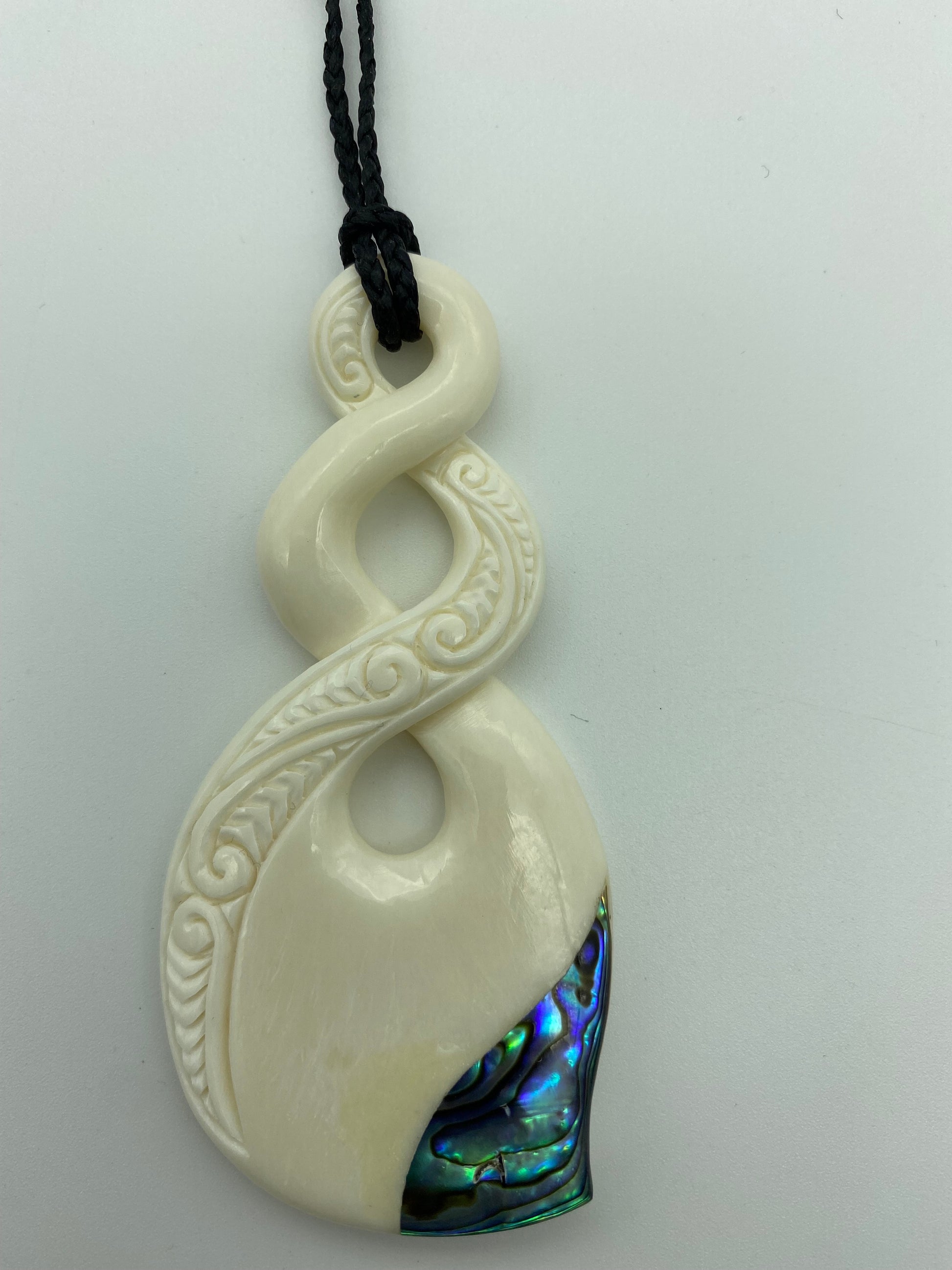 This beautiful bone Pikorua is a perfect combination of traditional Maori craftsmanship and modern touches. Hand-etched with intricate designs and featuring paua shell inlay, it is a treasured piece of art that reflects the culture and values of Aotearoa.