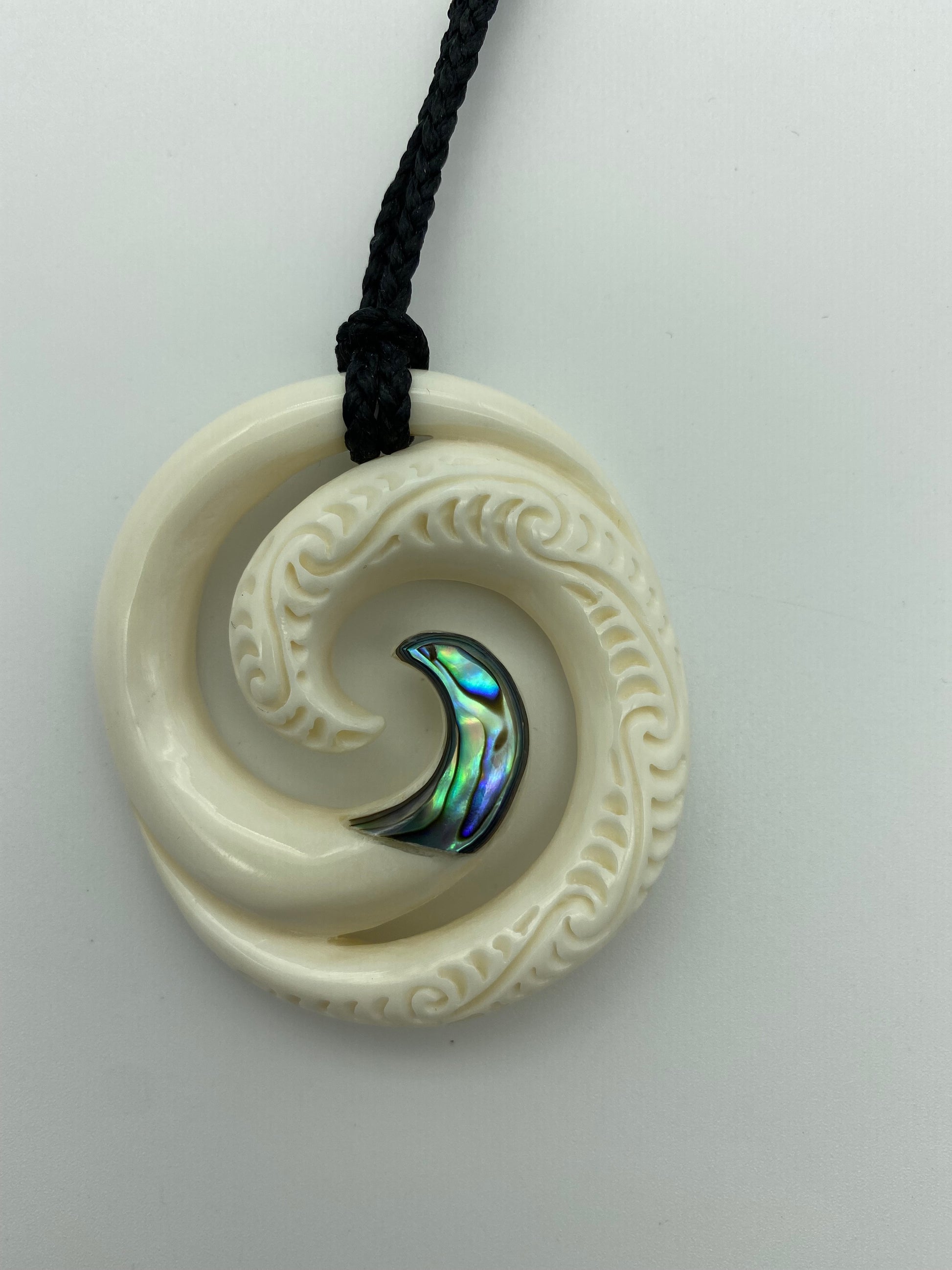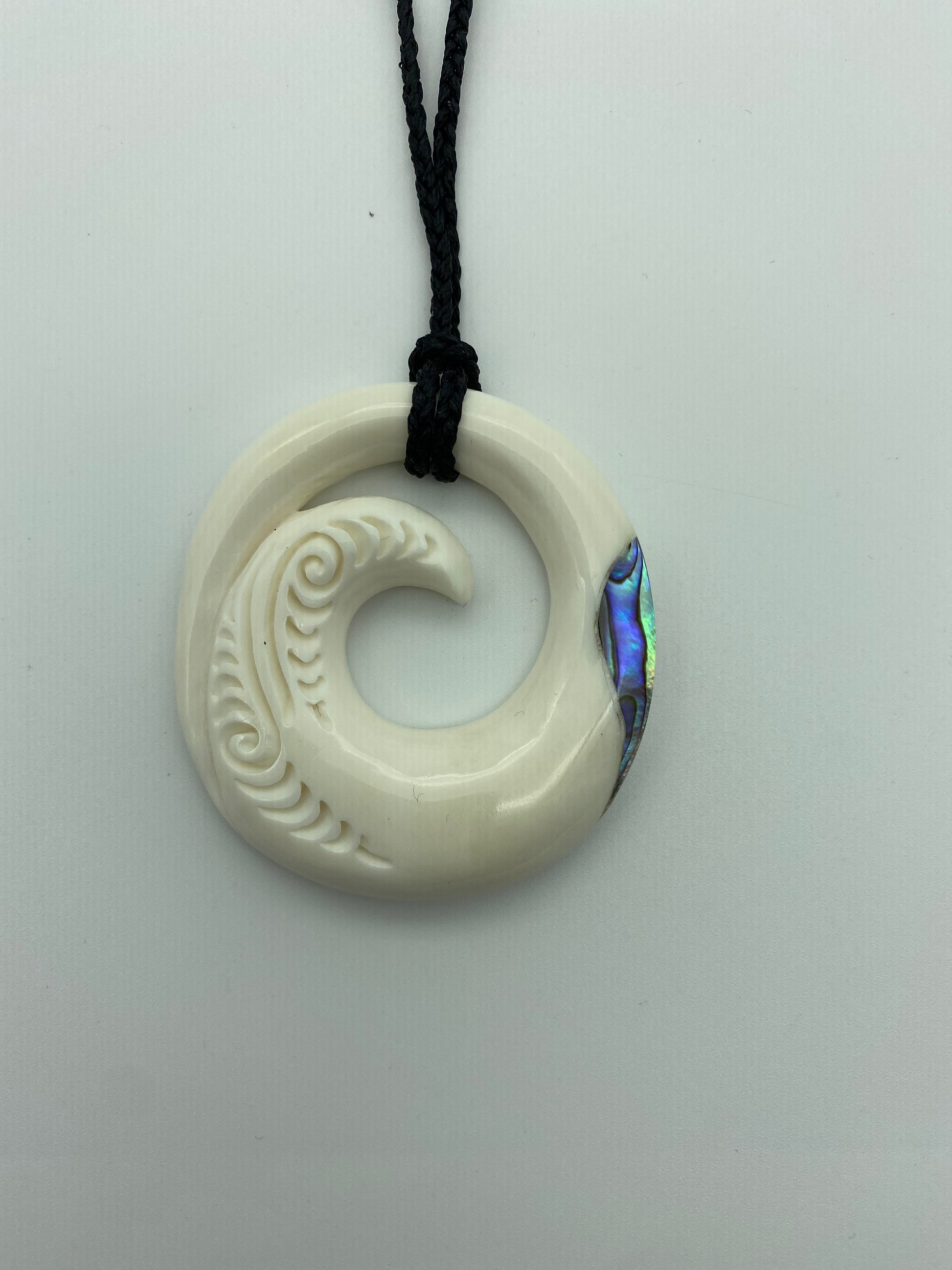 This Tripe Koru Bone Pendant is etched with beautiful designs and lower koru embellished with paua or abalone.