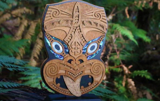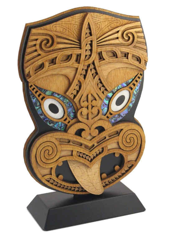Large Standing Wheku artwork (245mm high) crafted from plantation-grown gaboon using laser technology and hand-assembled. This single-sided piece of art boasts super fine detail, and paua inlay and comes complete with a stylish black base, related story, and protective box.