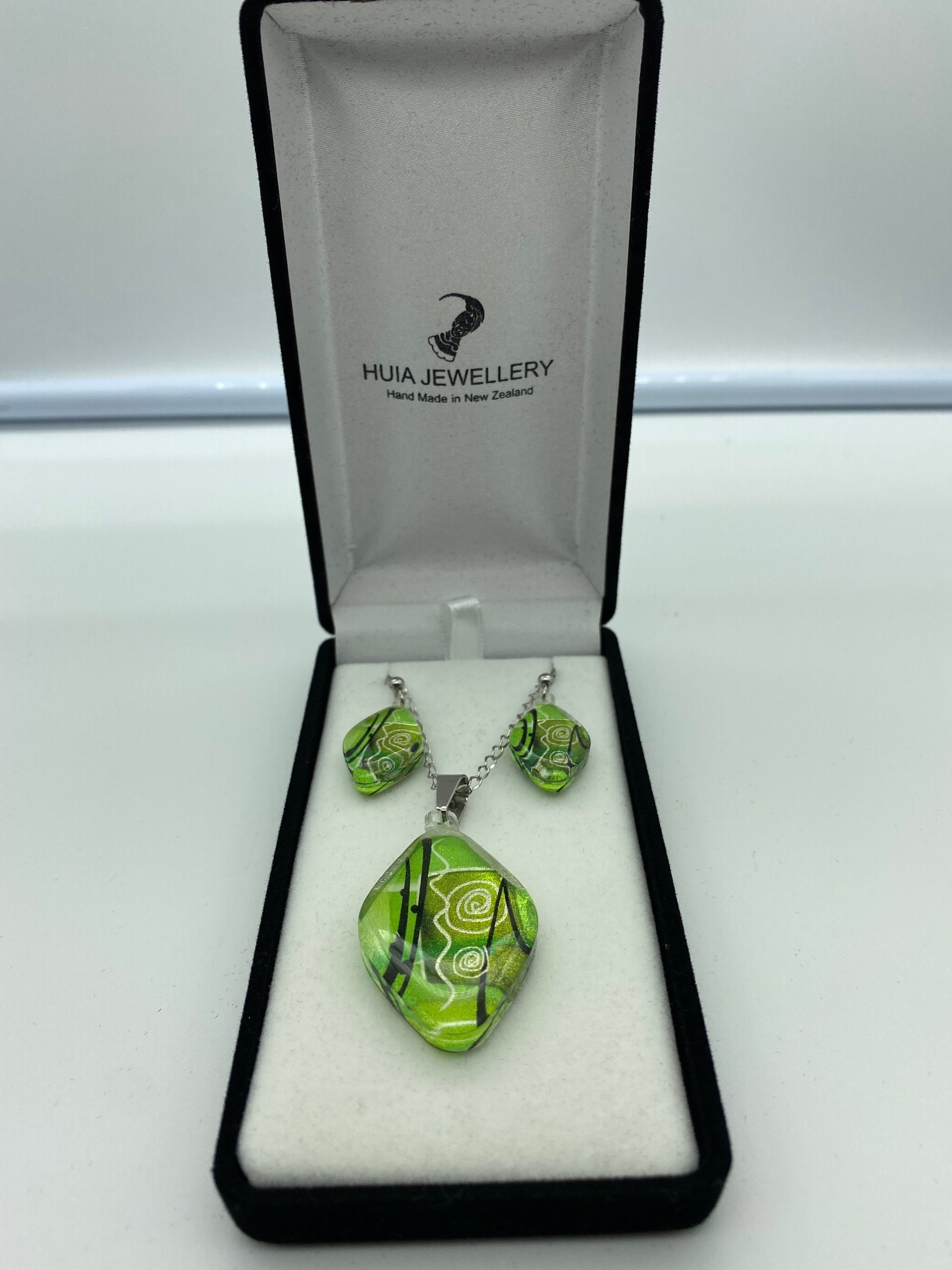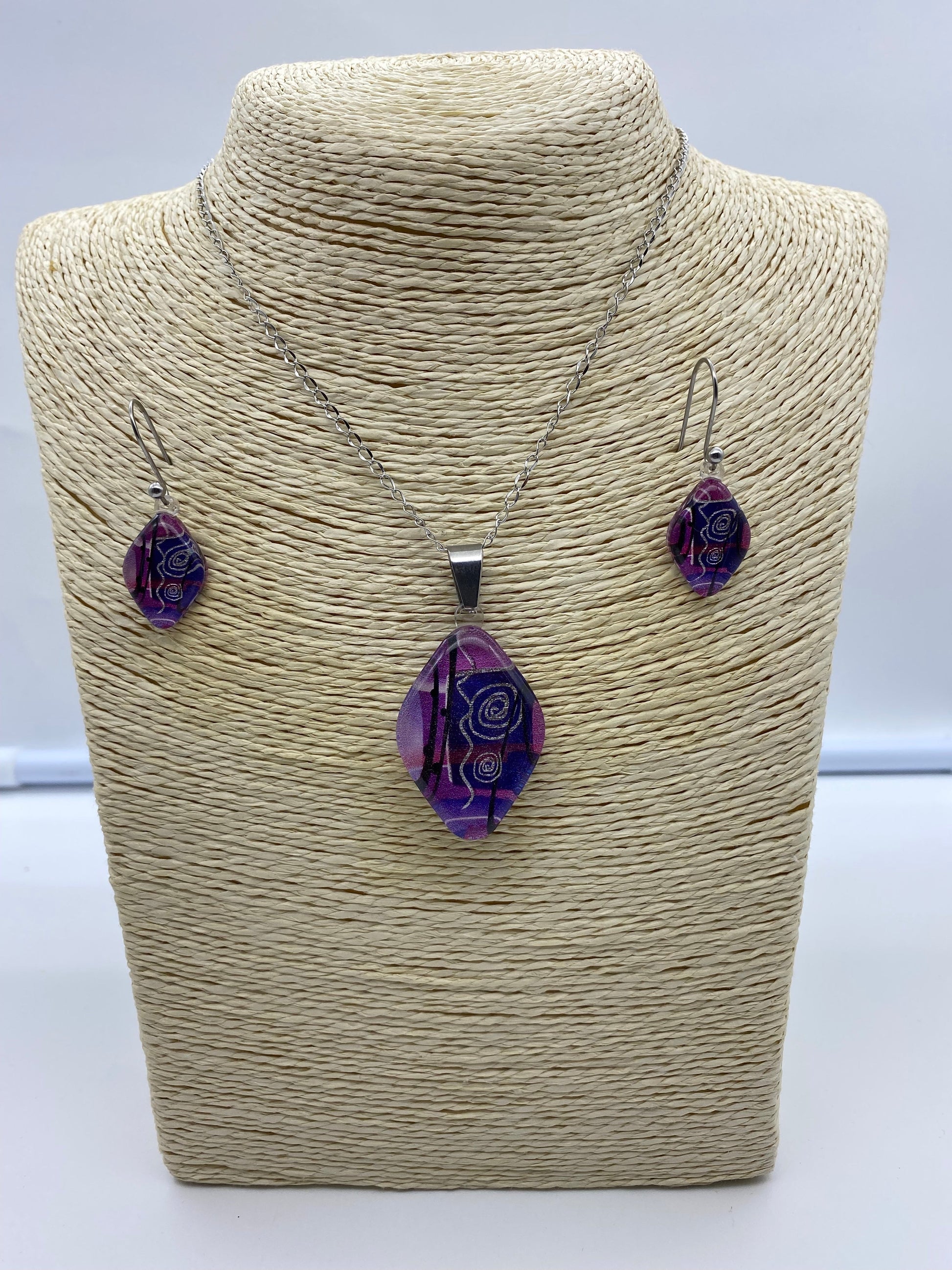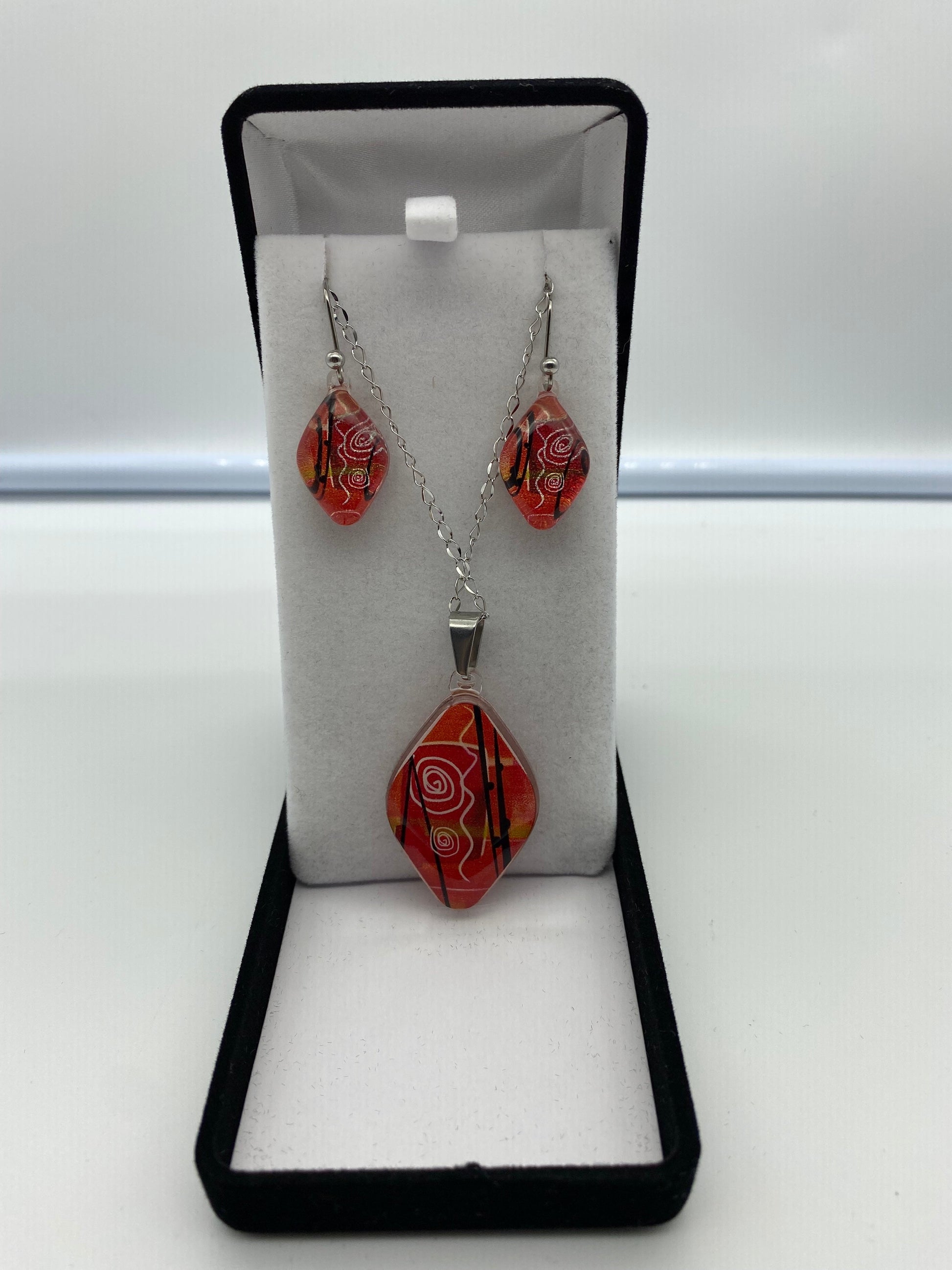 This diamond shaped Pendant & Earring Set is set in resin with a sterling silver chain and clasp. Available in several colours and various designs within the resin.