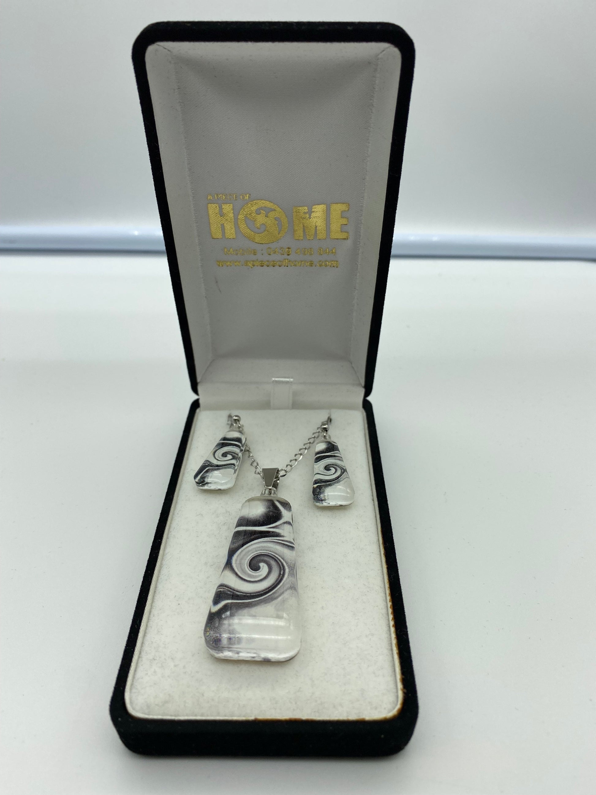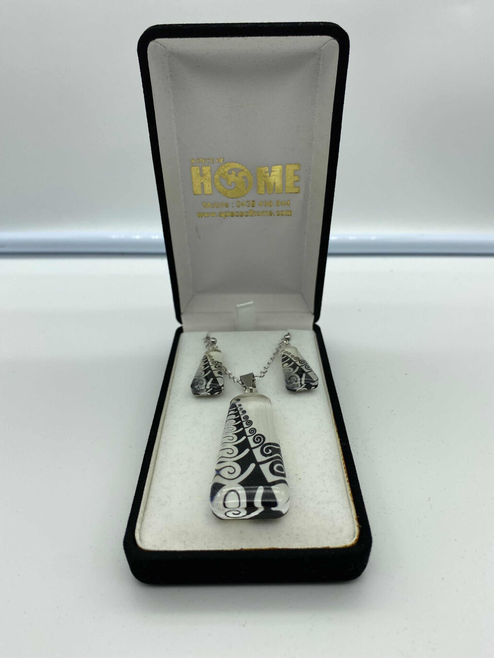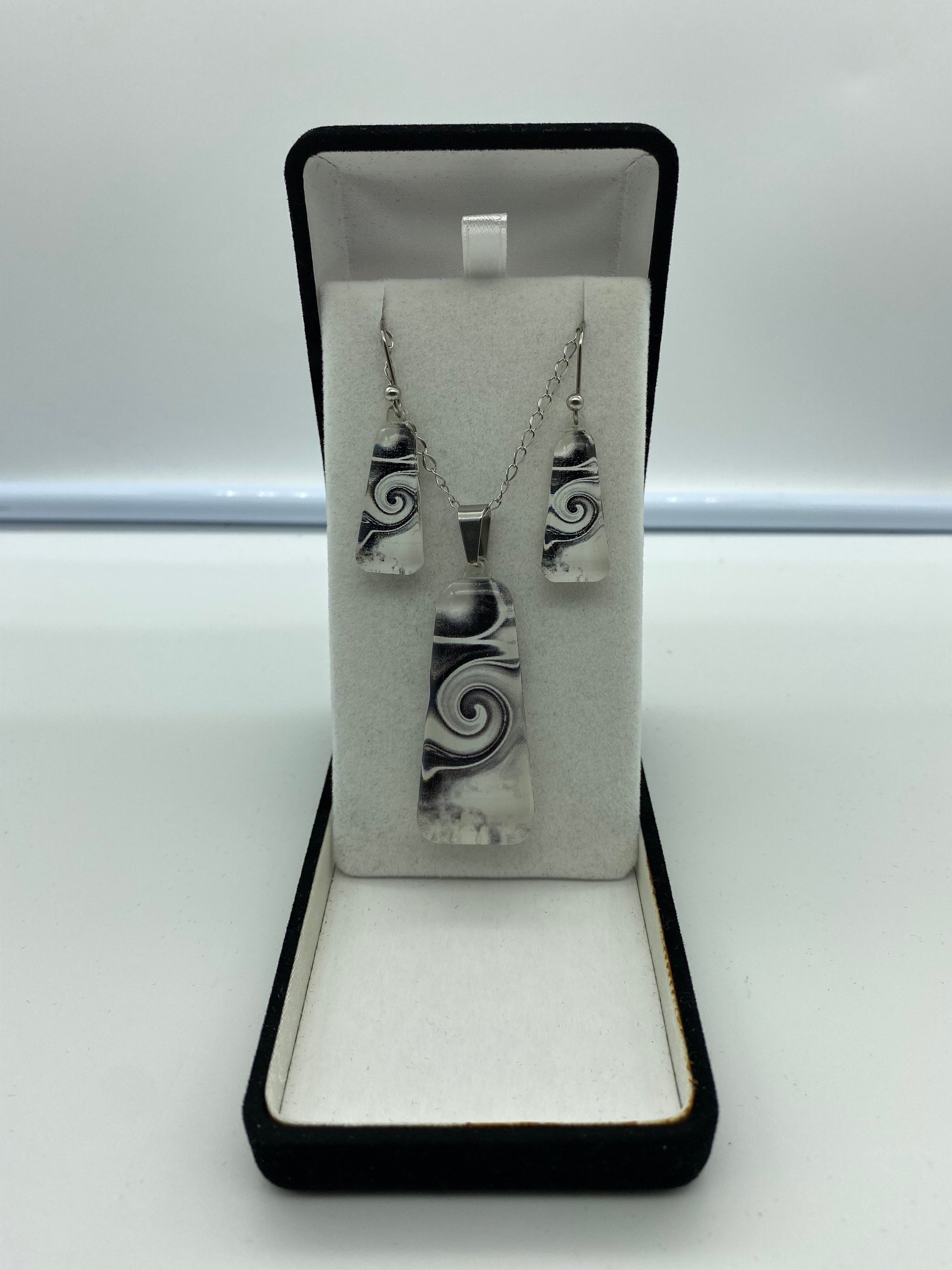 This Toki shaped Pendant & Earring Set is set in resin with a sterling silver chain and clasp. Available in several colours and various designs within the resin.