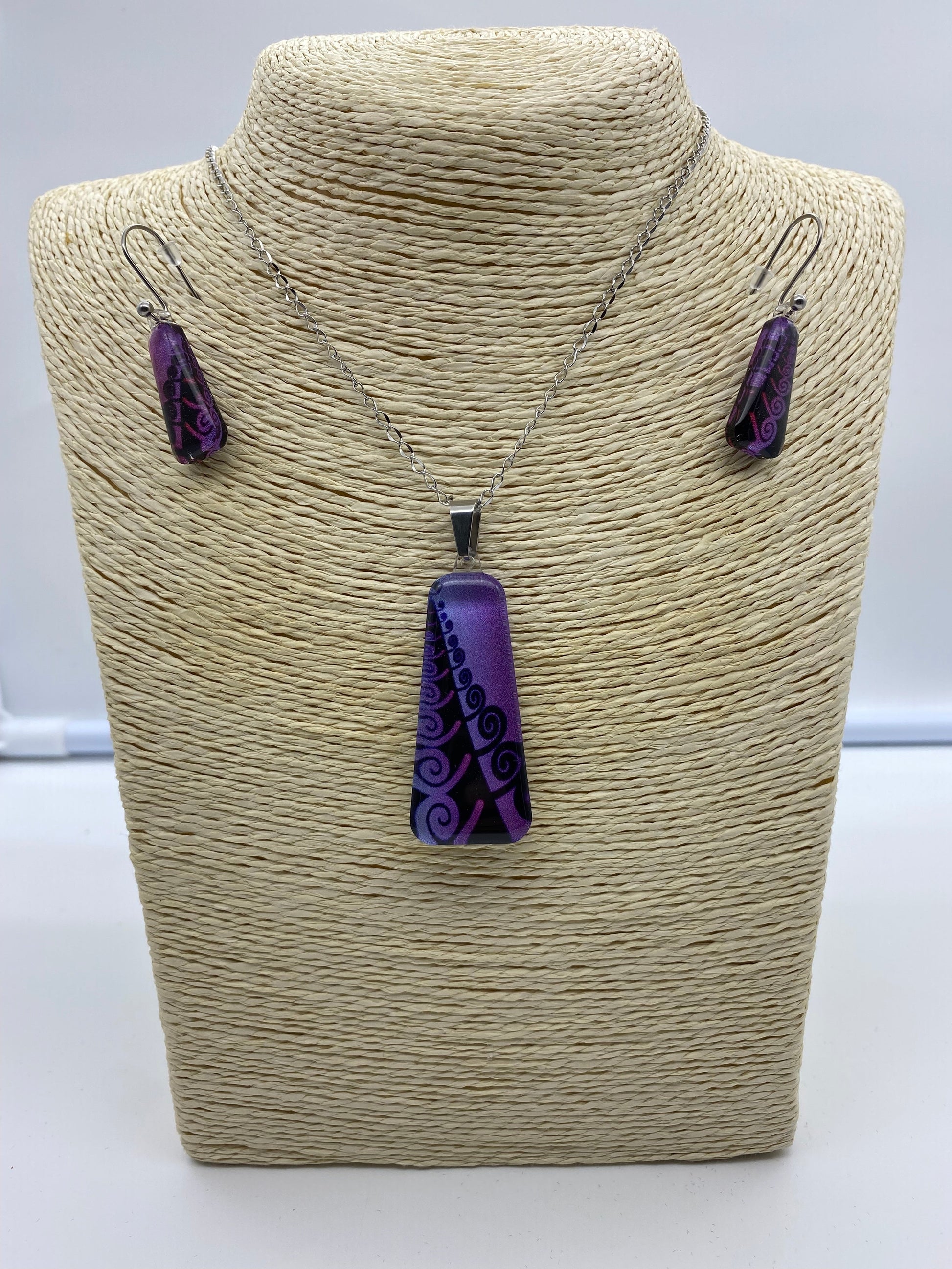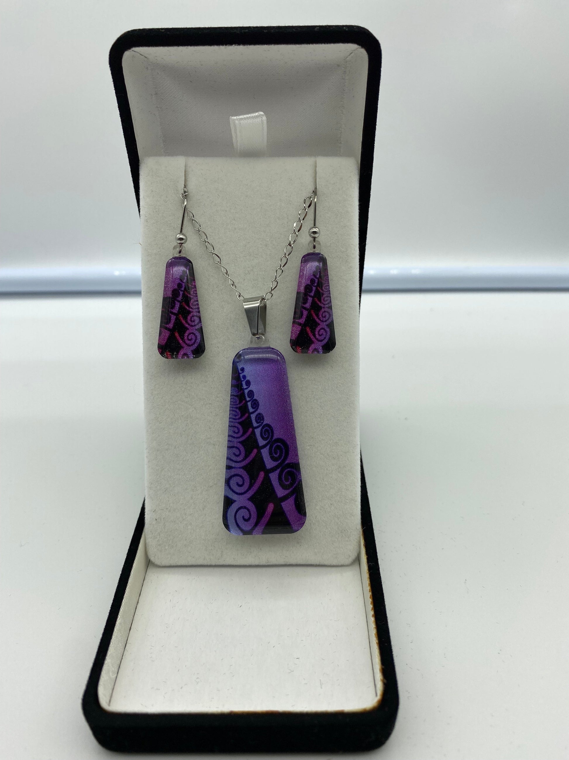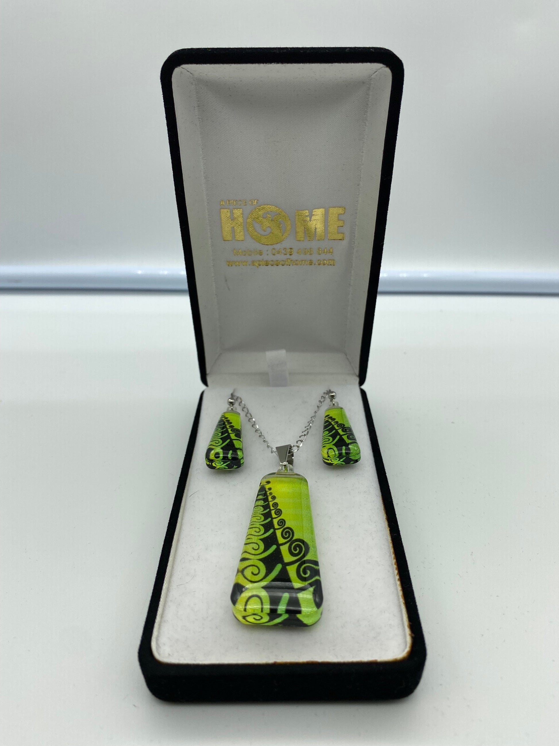 This Toki shaped Pendant & Earring Set is set in resin with a sterling silver chain and clasp. Available in several colours and various designs within the resin.