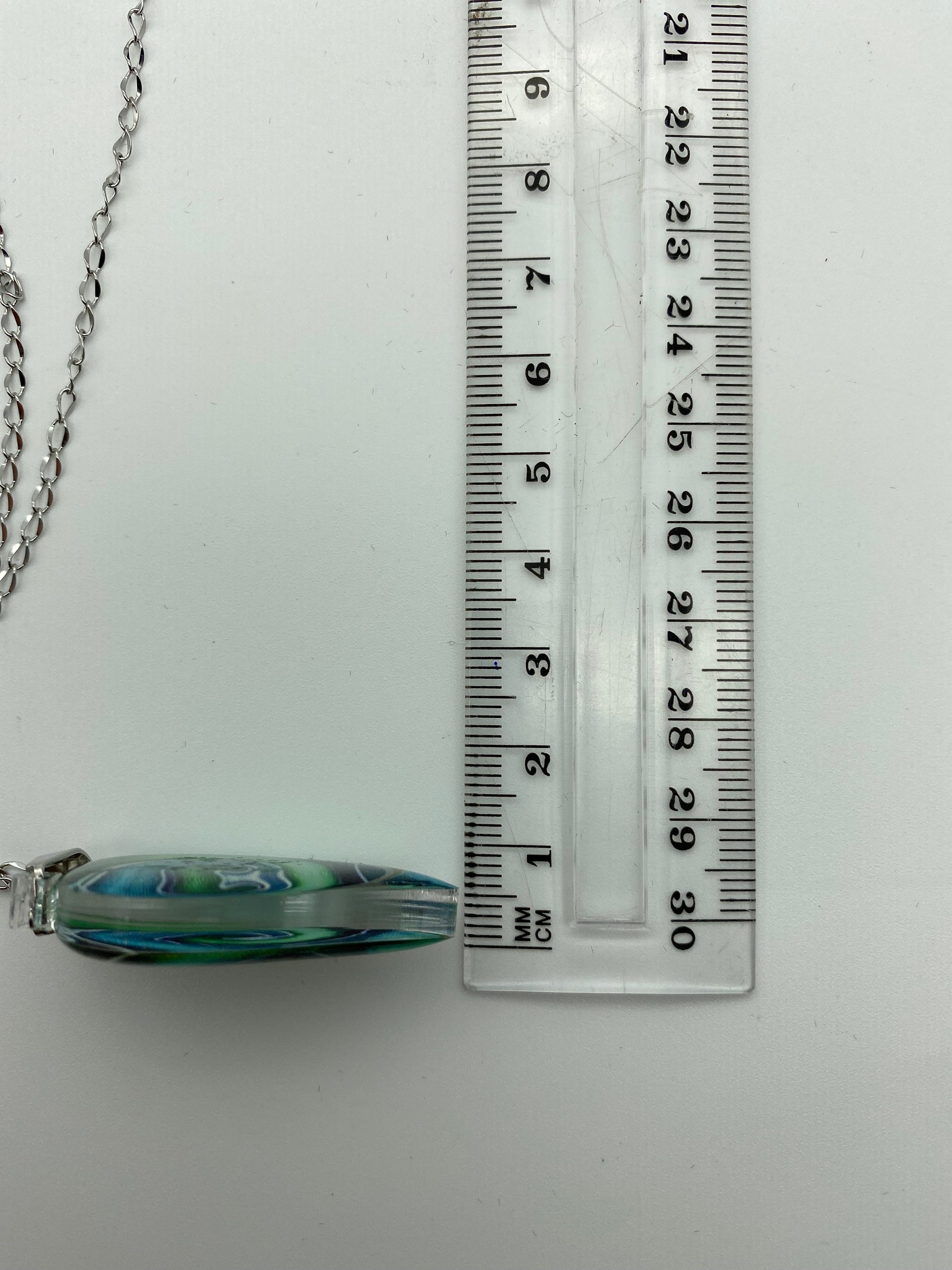 This Drop shaped Pendant & Earring Set is set in resin with a sterling silver chain and clasp. Available in several colours and various designs within the resin.