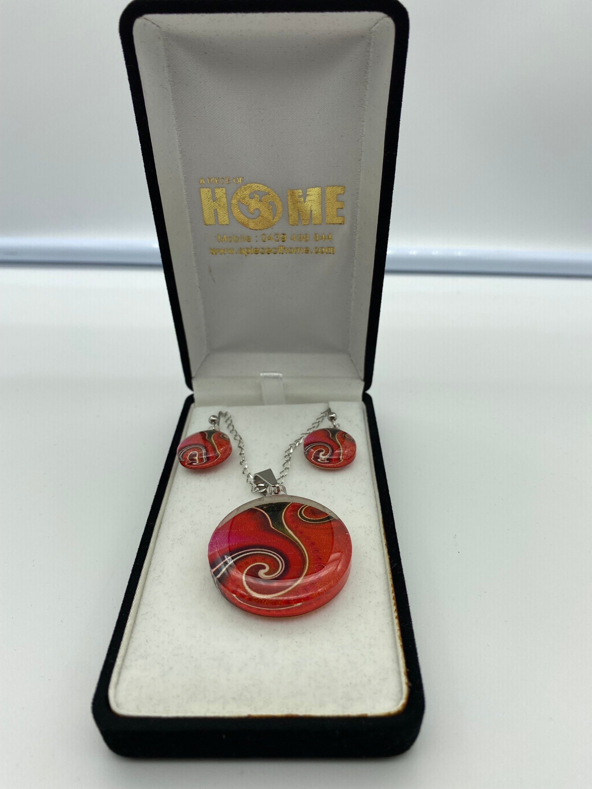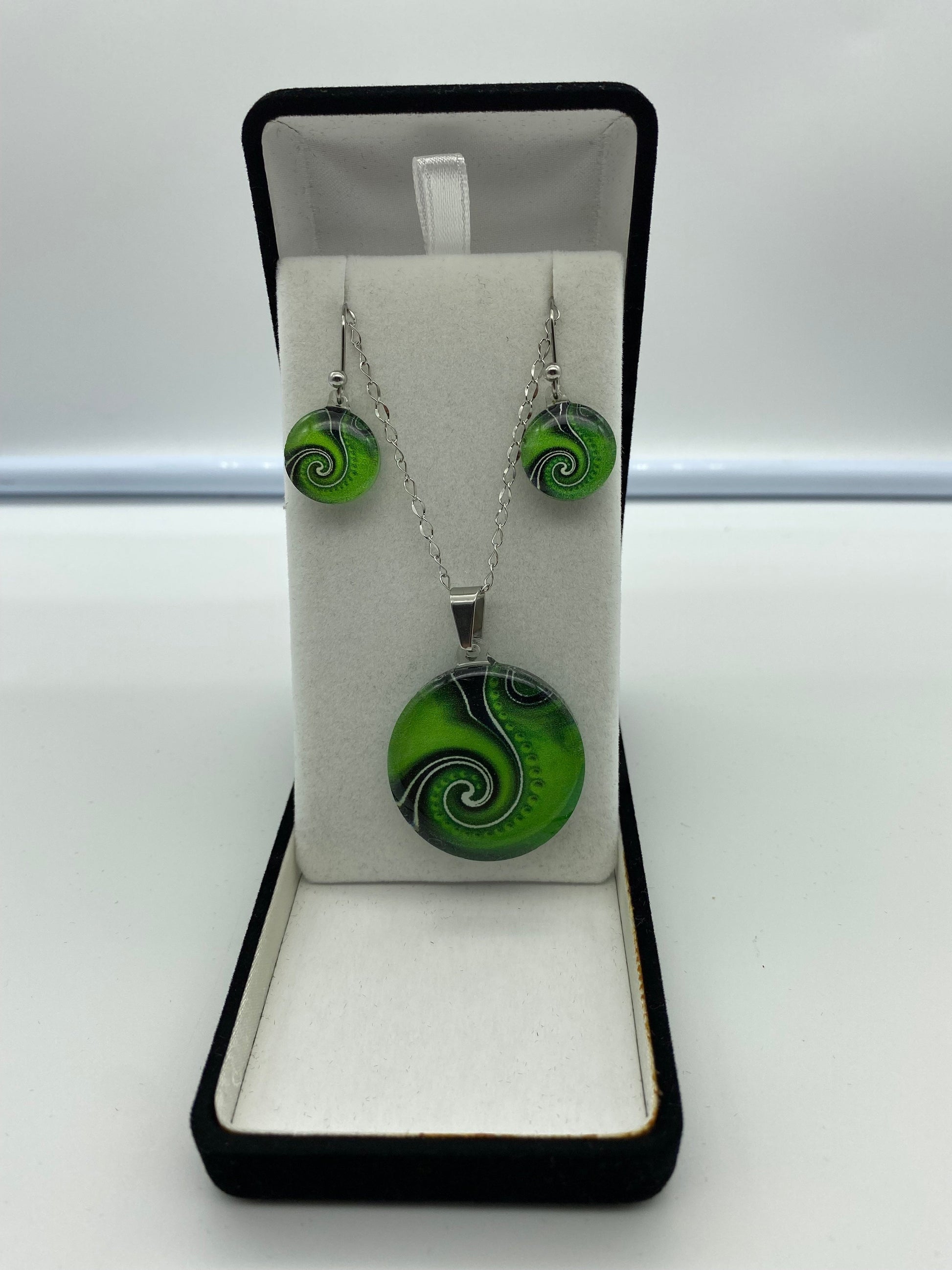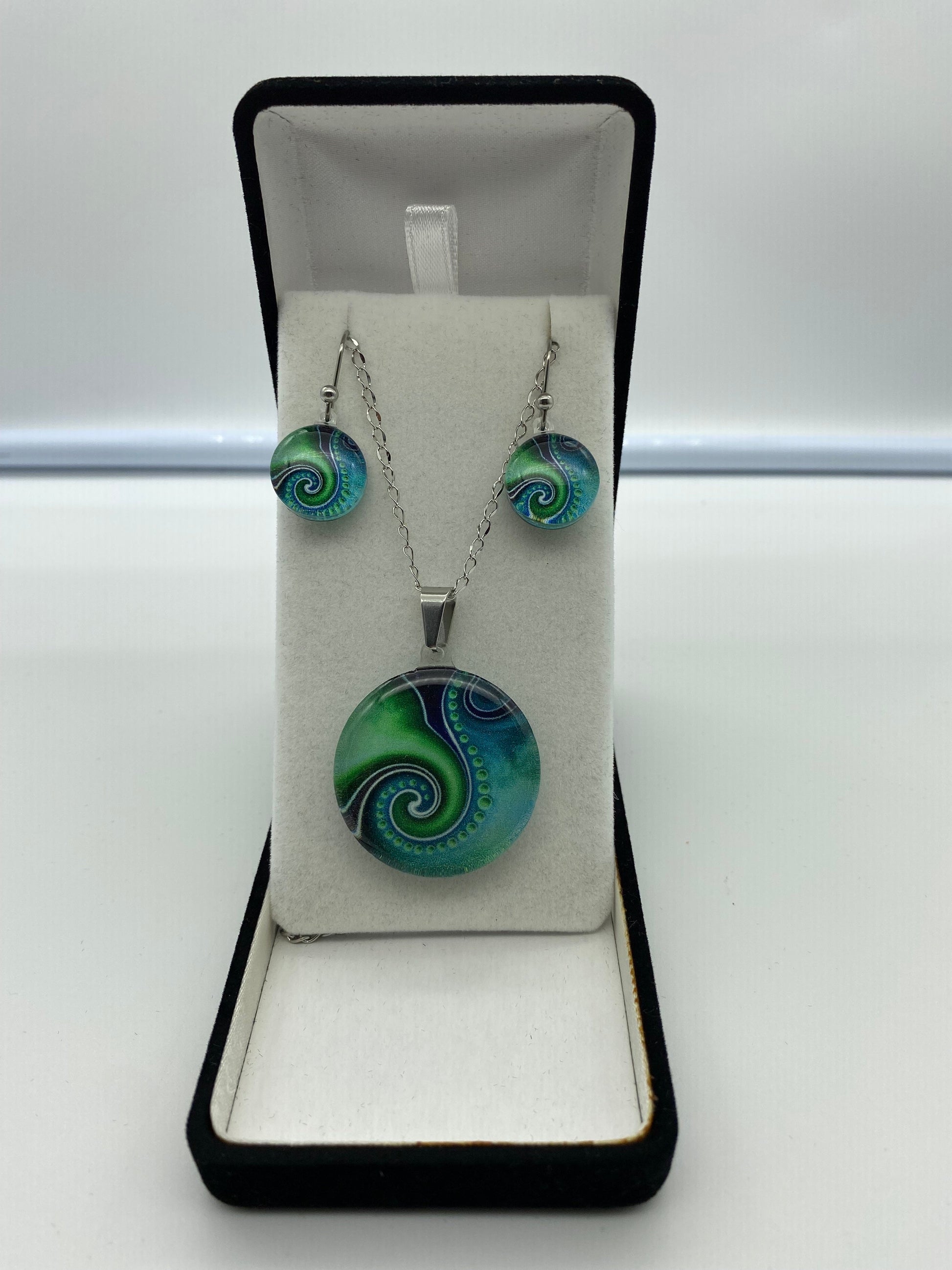 This circle shaped Pendant & Earring Set is set in resin with a sterling silver chain and clasp. Available in several colours and various designs within the resin.
