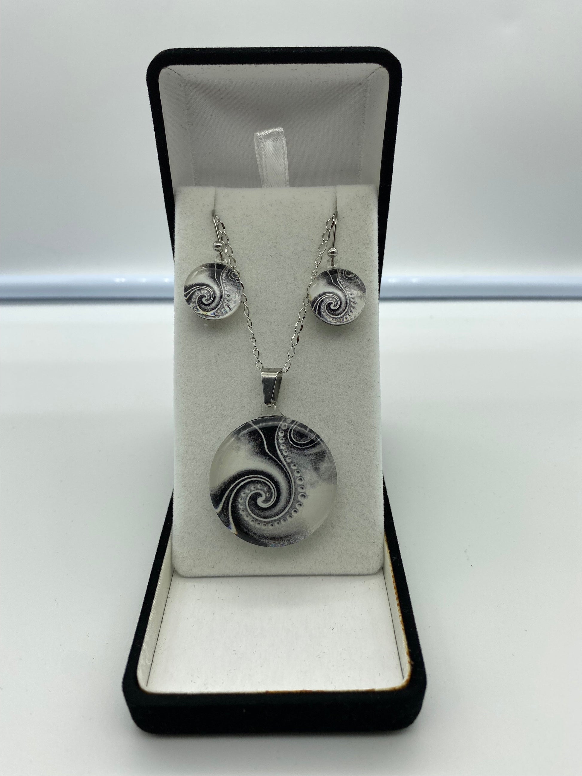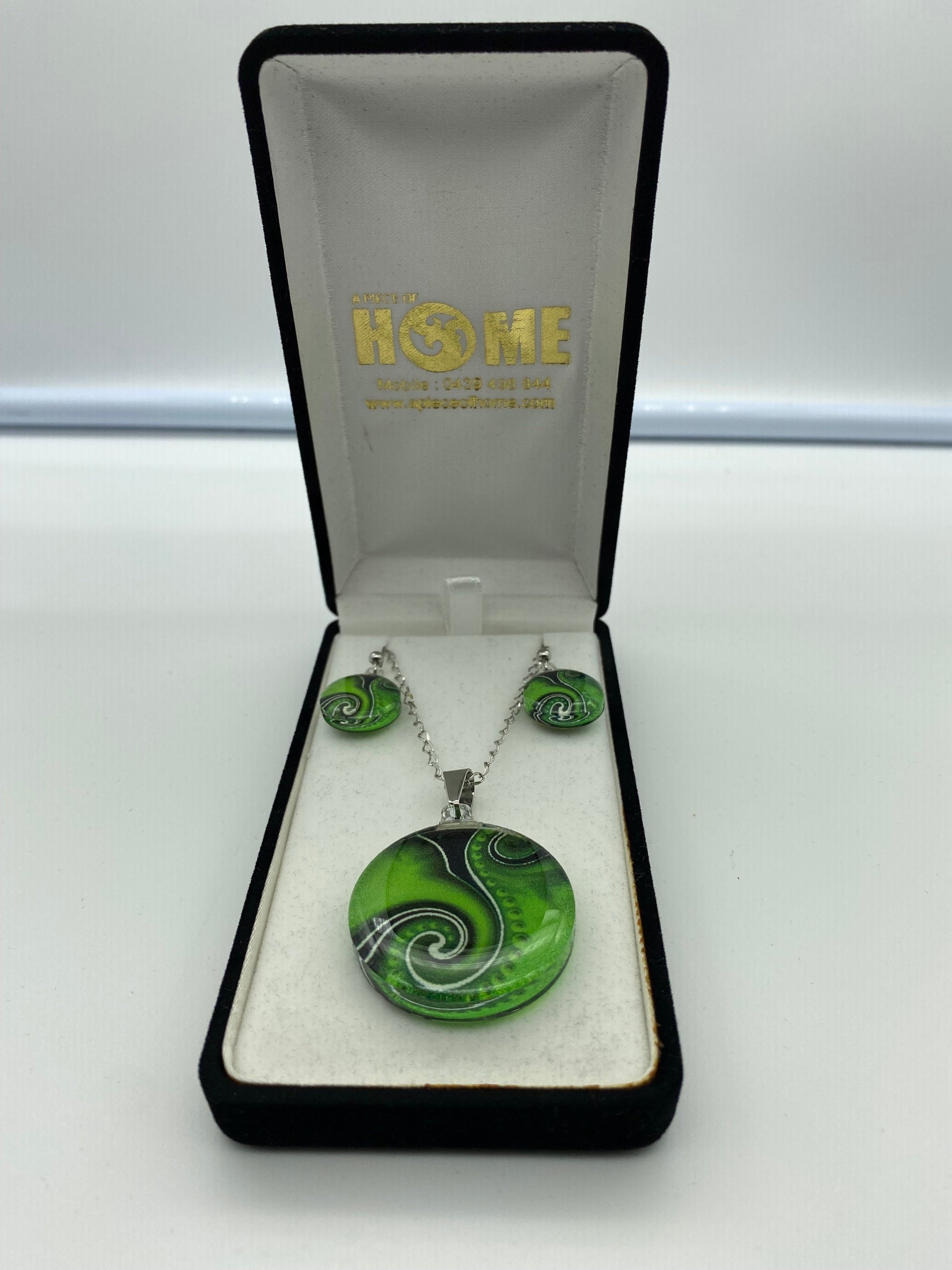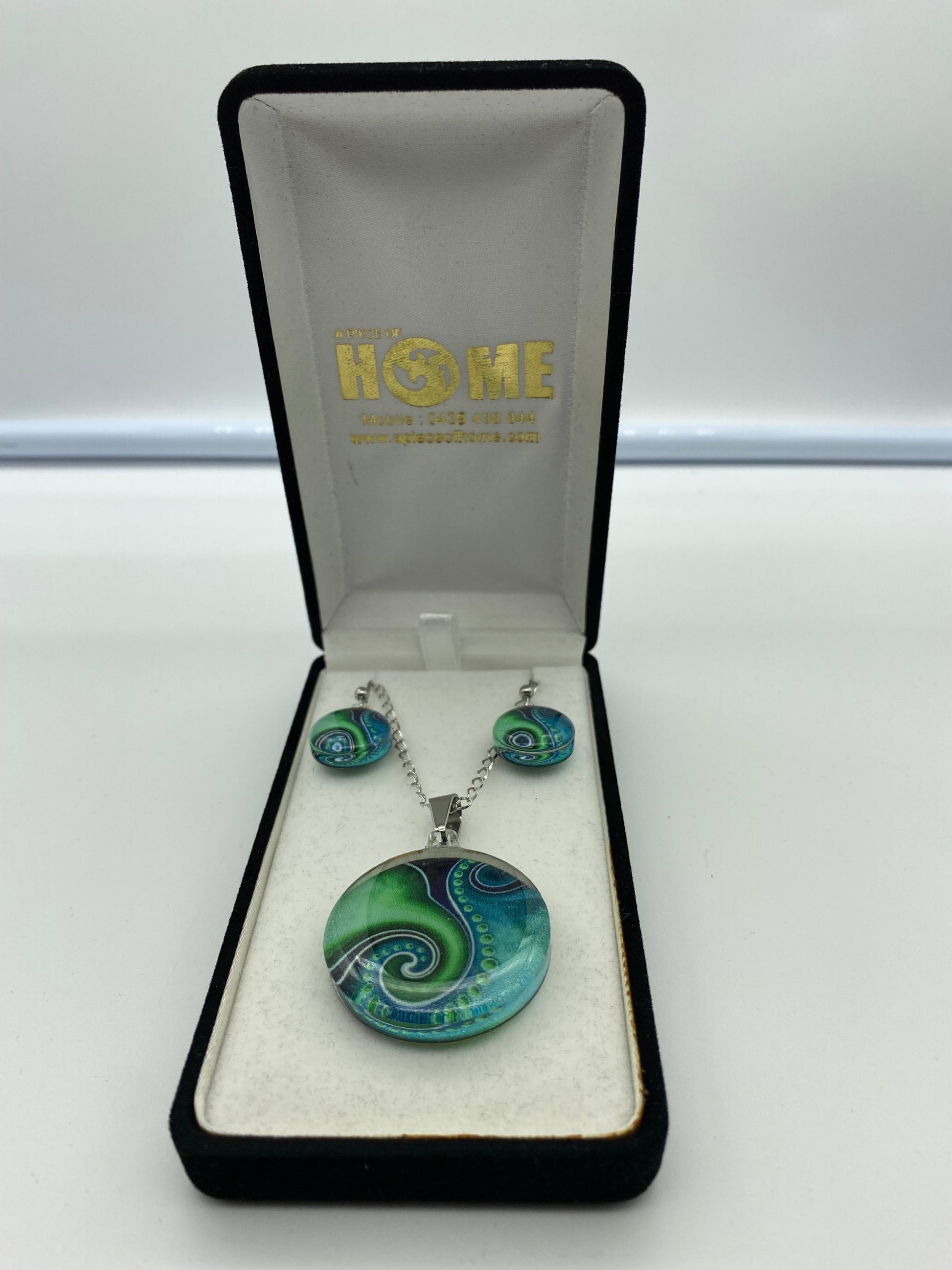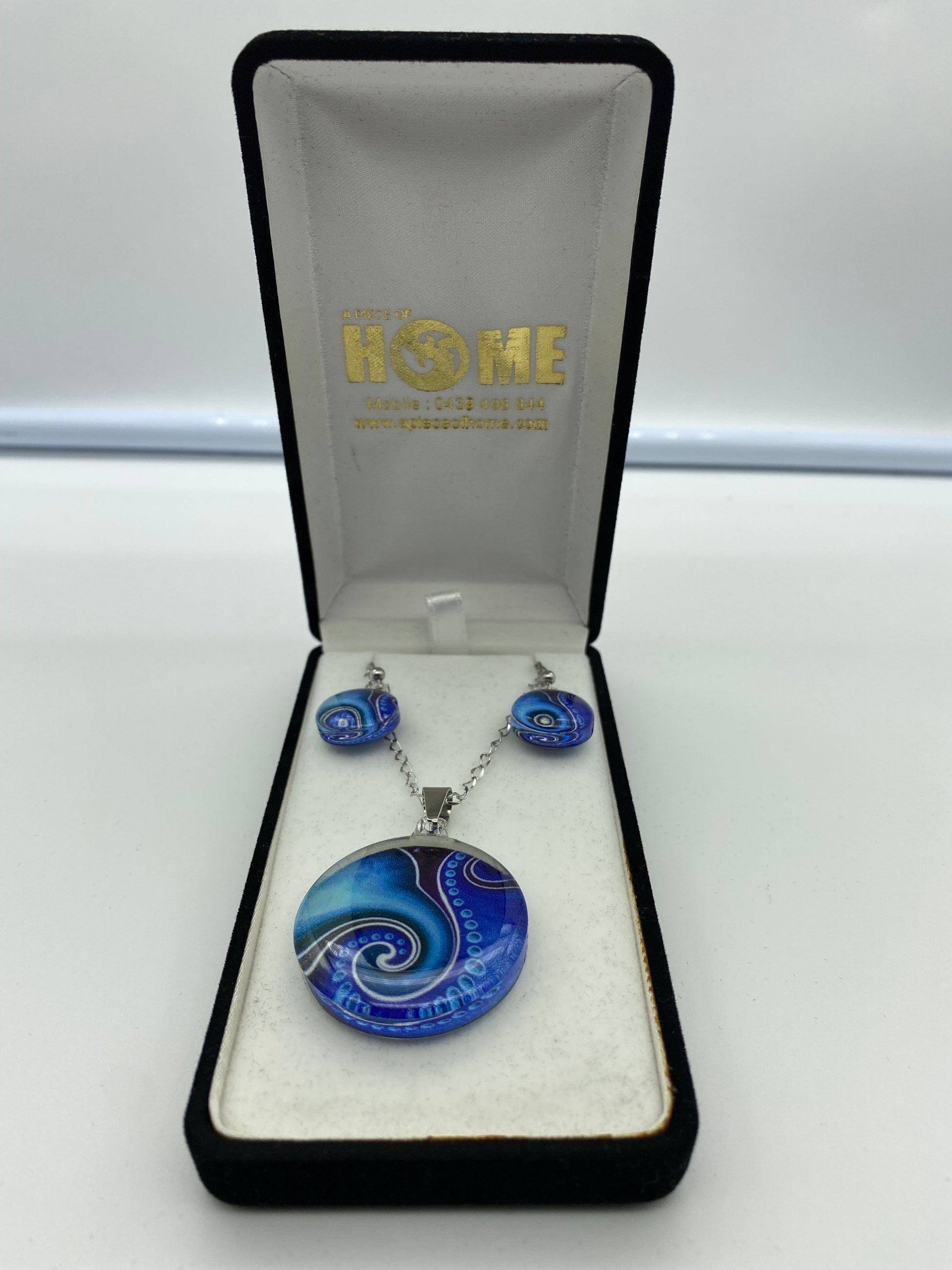This circle shaped Pendant & Earring Set is set in resin with a sterling silver chain and clasp. Available in several colours and various designs within the resin.