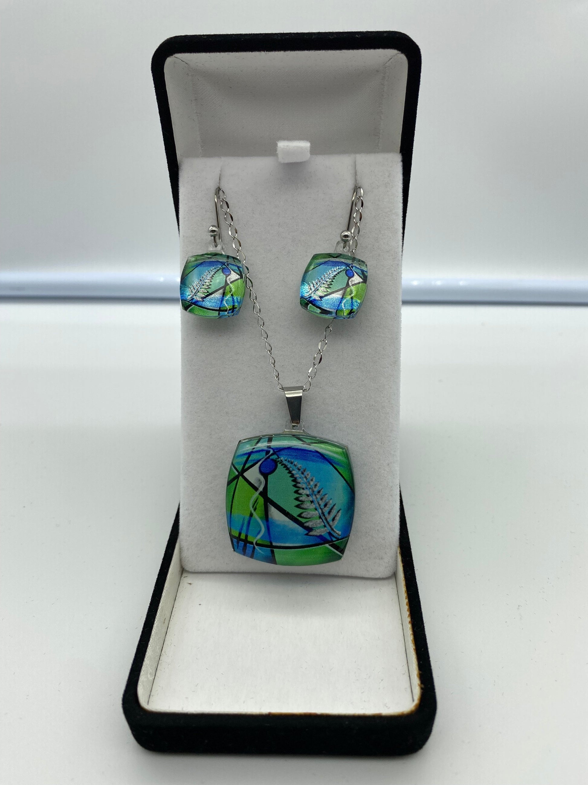 This tear drop shaped Pendant & Earring Set is set in resin with a sterling silver chain and clasp. Available in several colours and various designs within the resin.