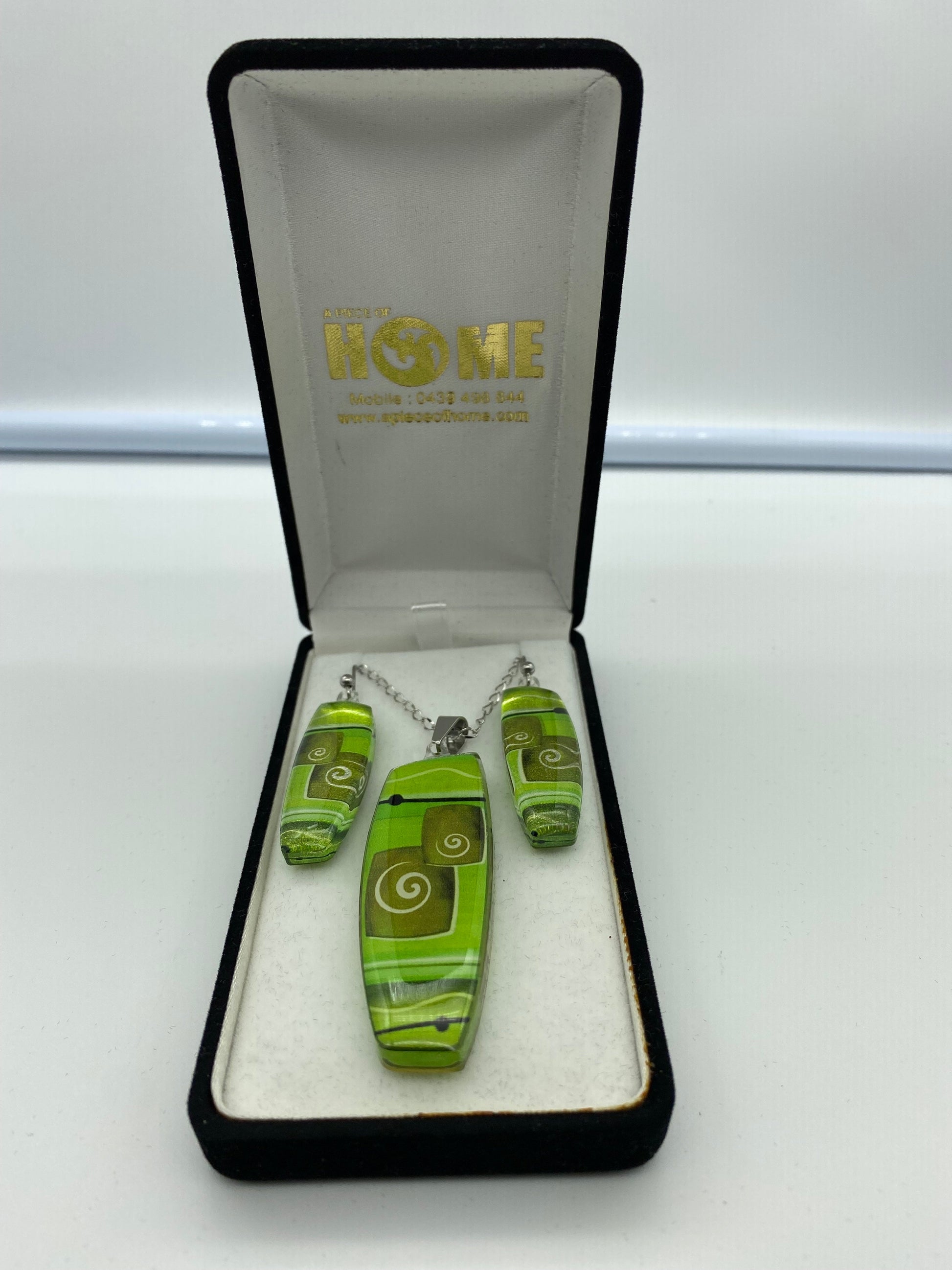 This tear drop shaped Pendant & Earring Set is set in resin with a sterling silver chain and clasp. Available in several colours and various designs within the resin.