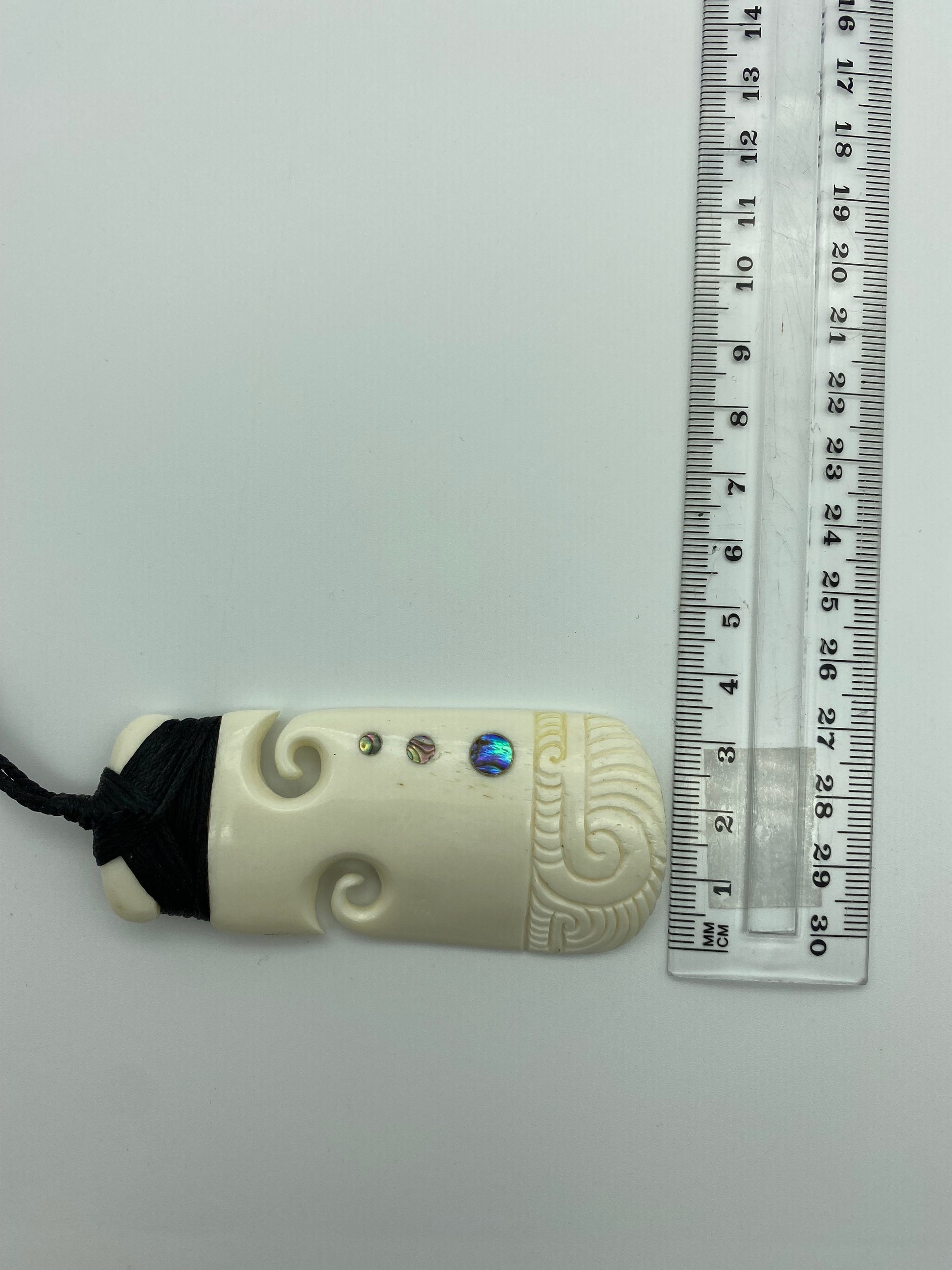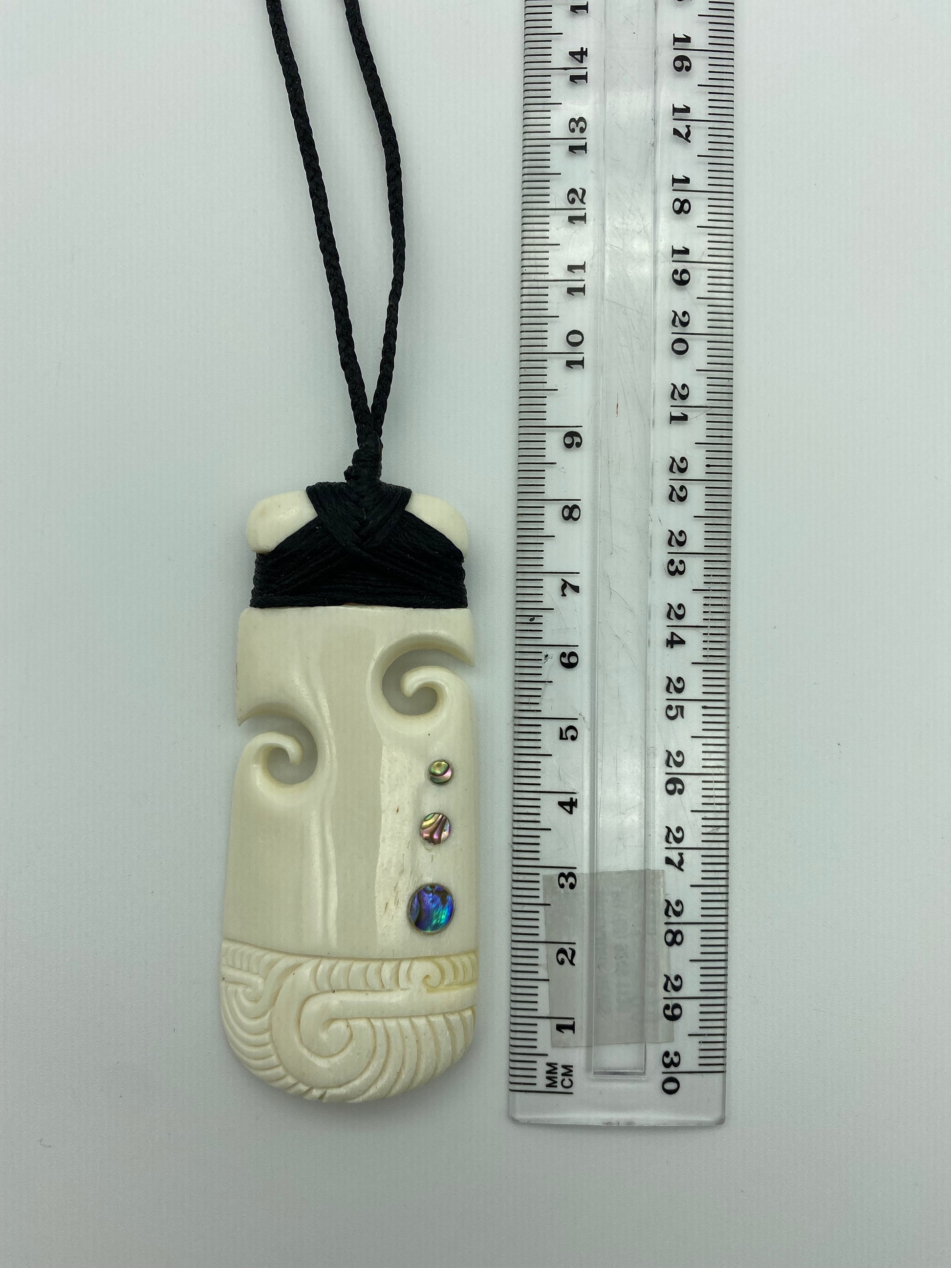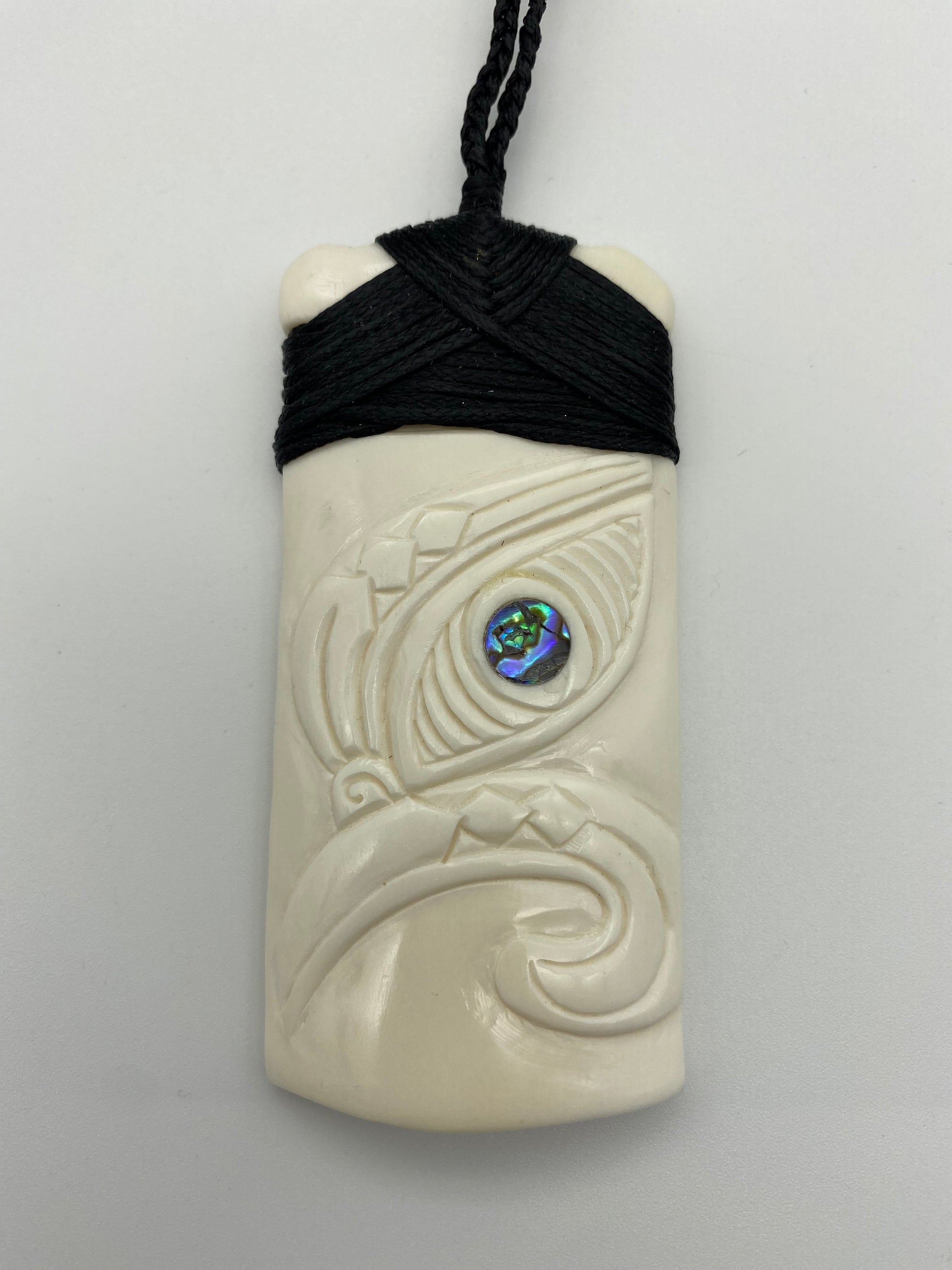 This bone Toki has two koru carved into each side, with three paua inlays, that increase in size as they descend. It is then etched along the bottom.