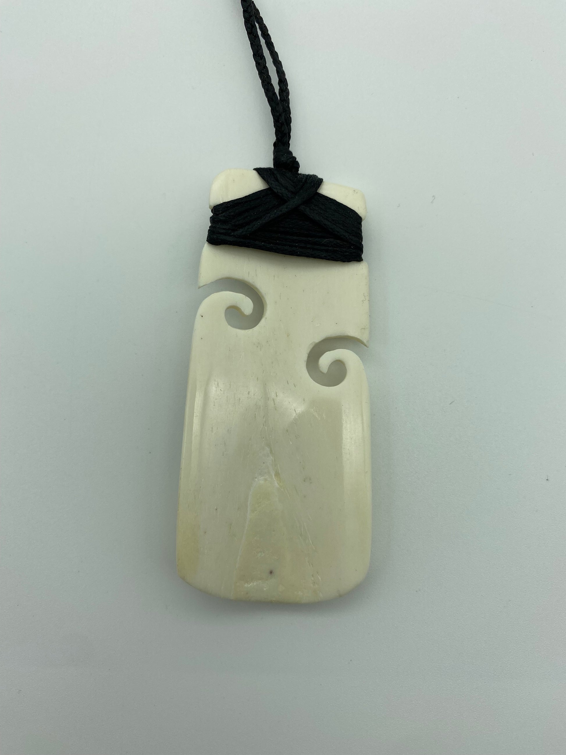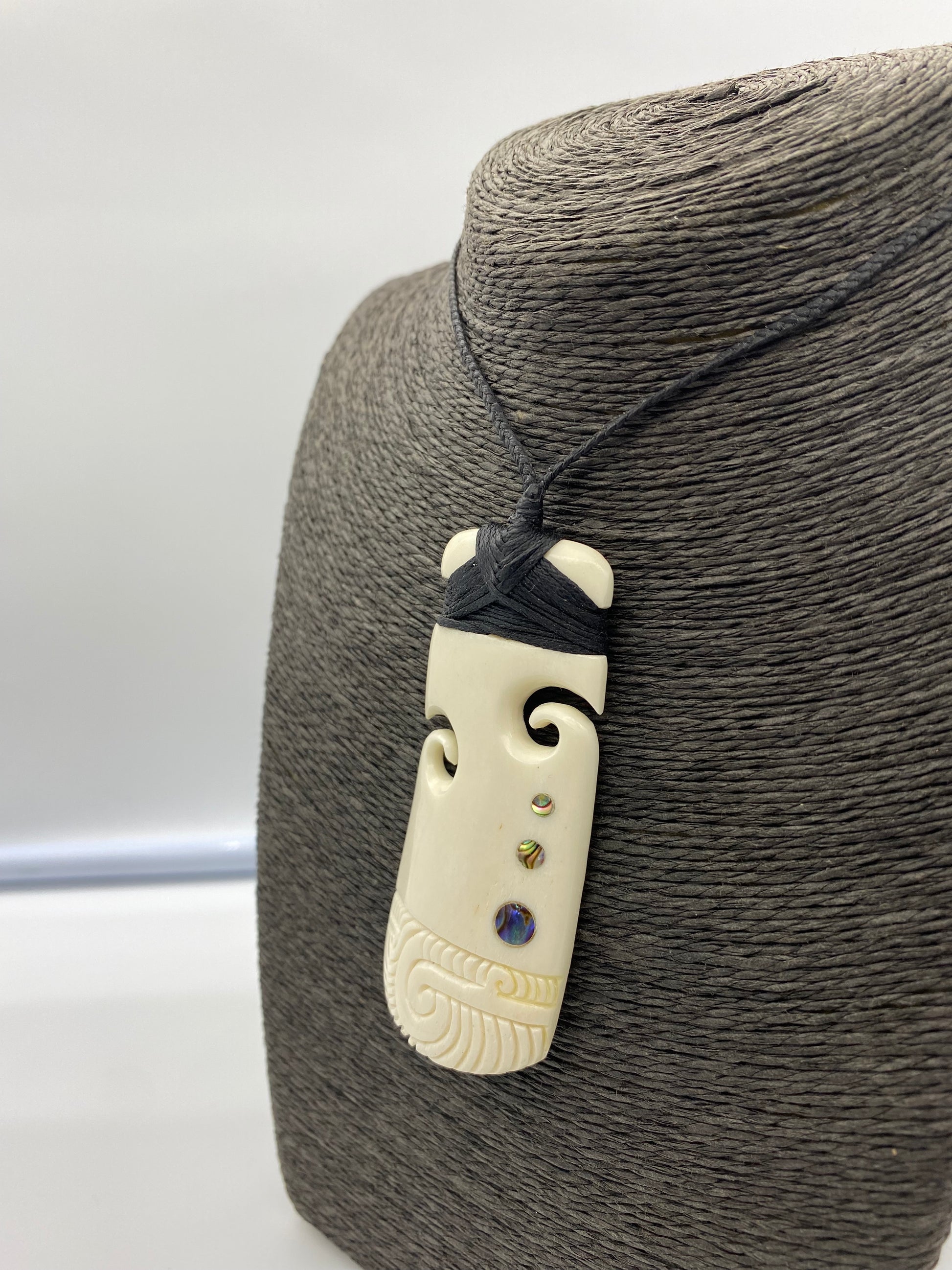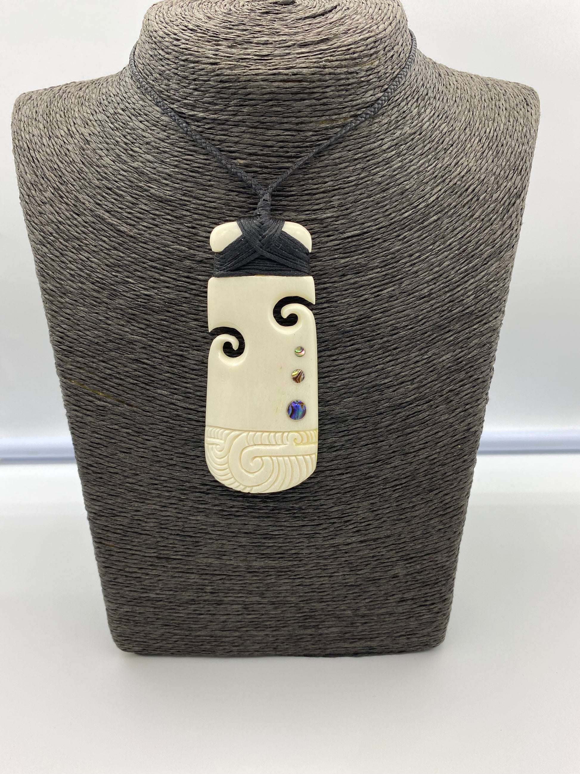This bone Toki has two koru carved into each side, with three paua inlays, that increase in size as they descend. It is then etched along the bottom.