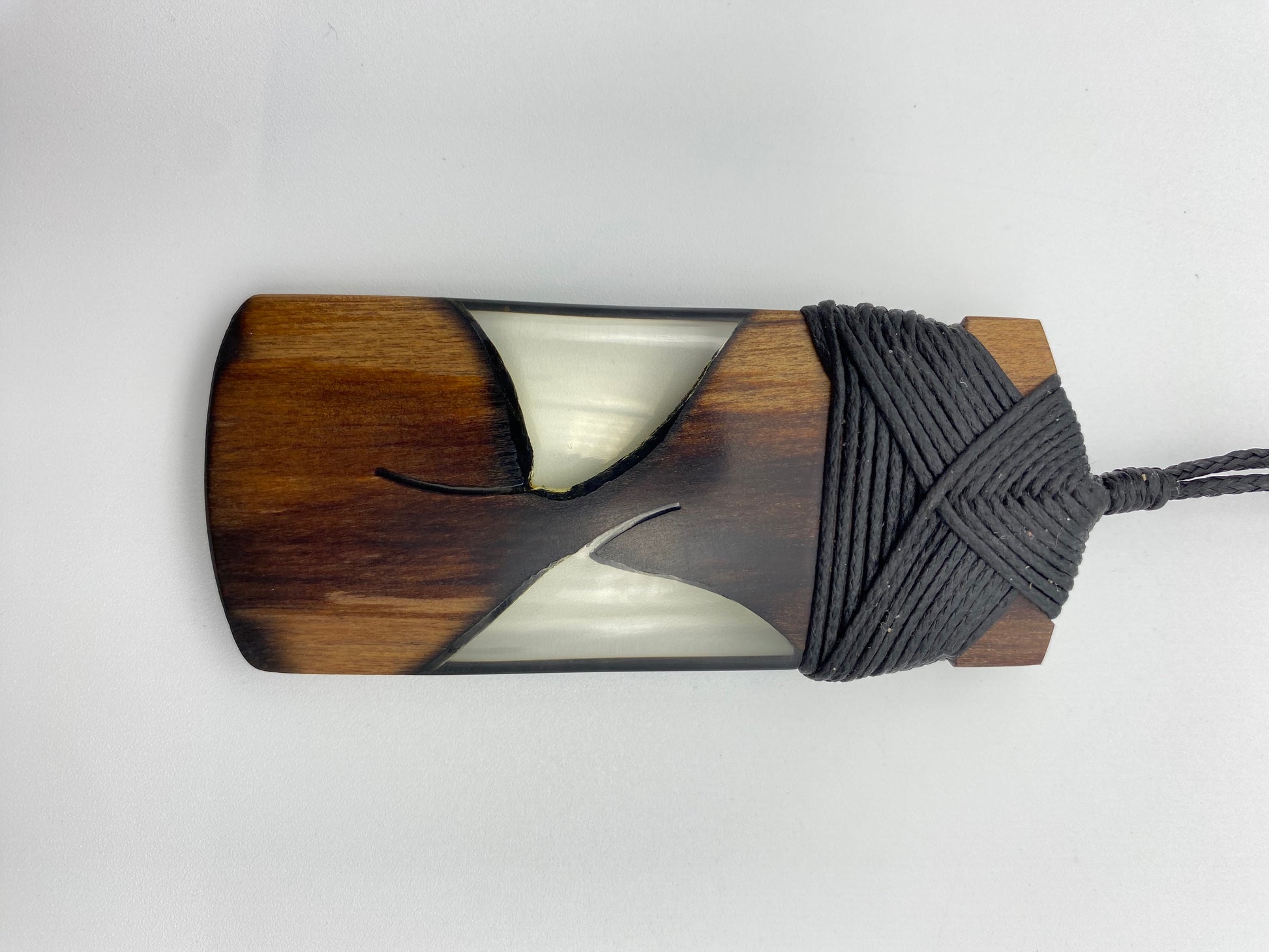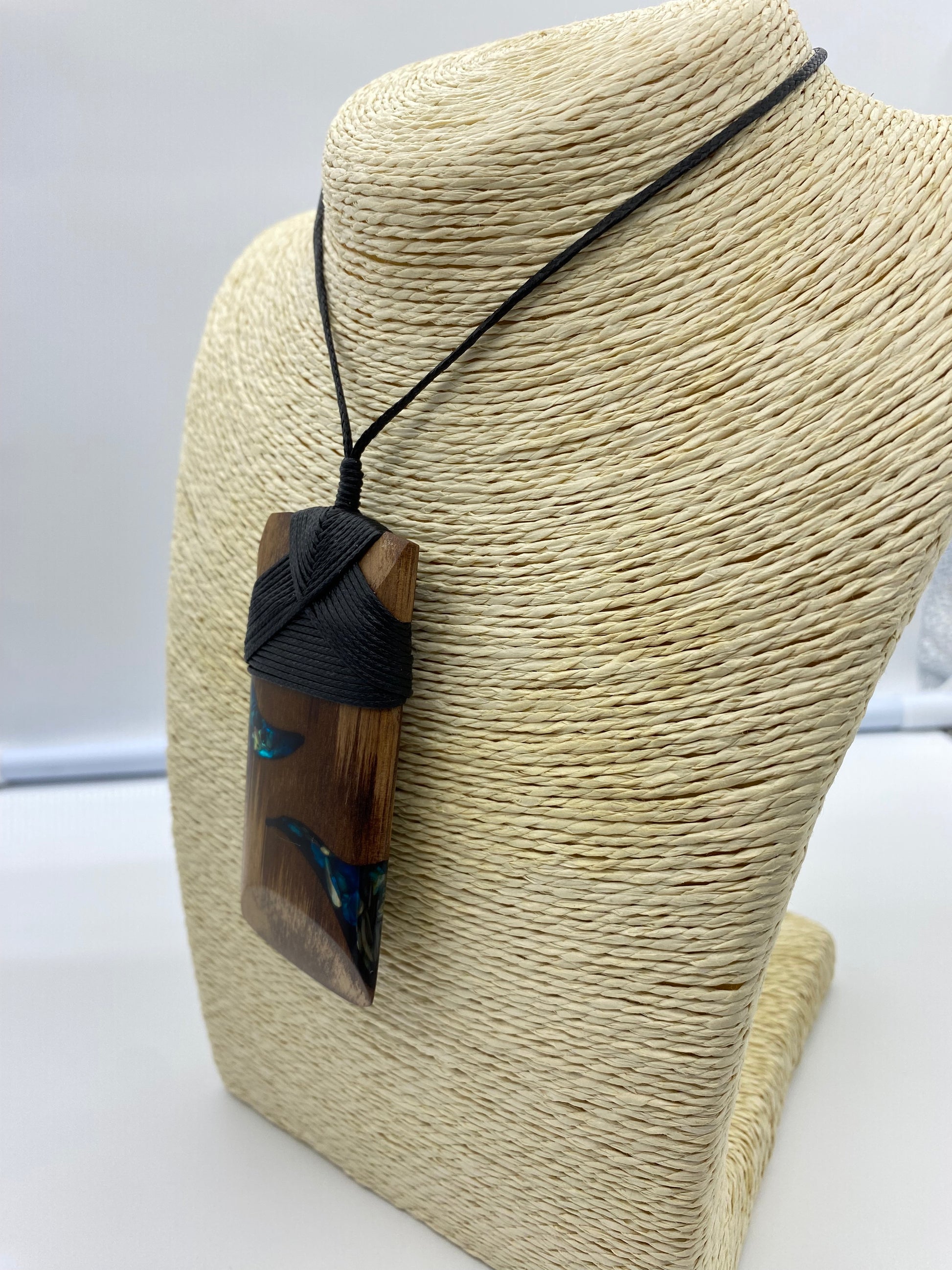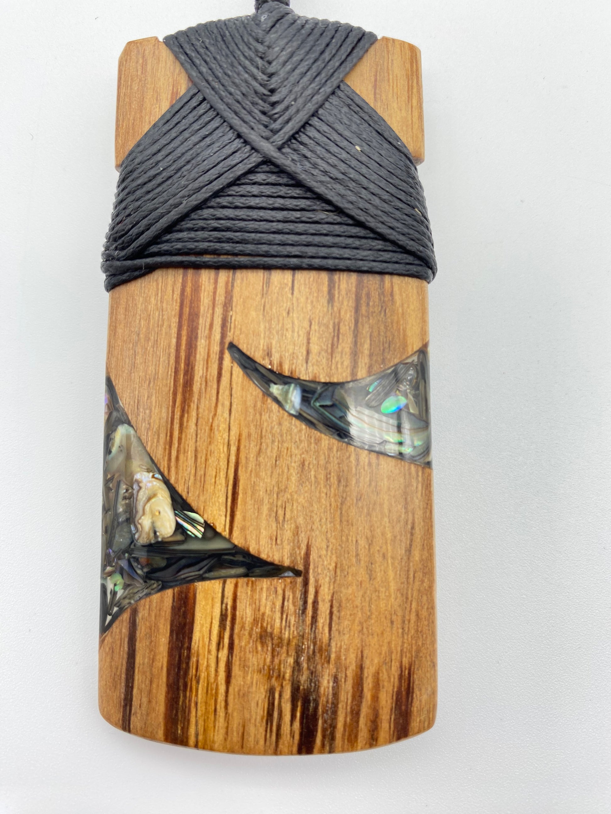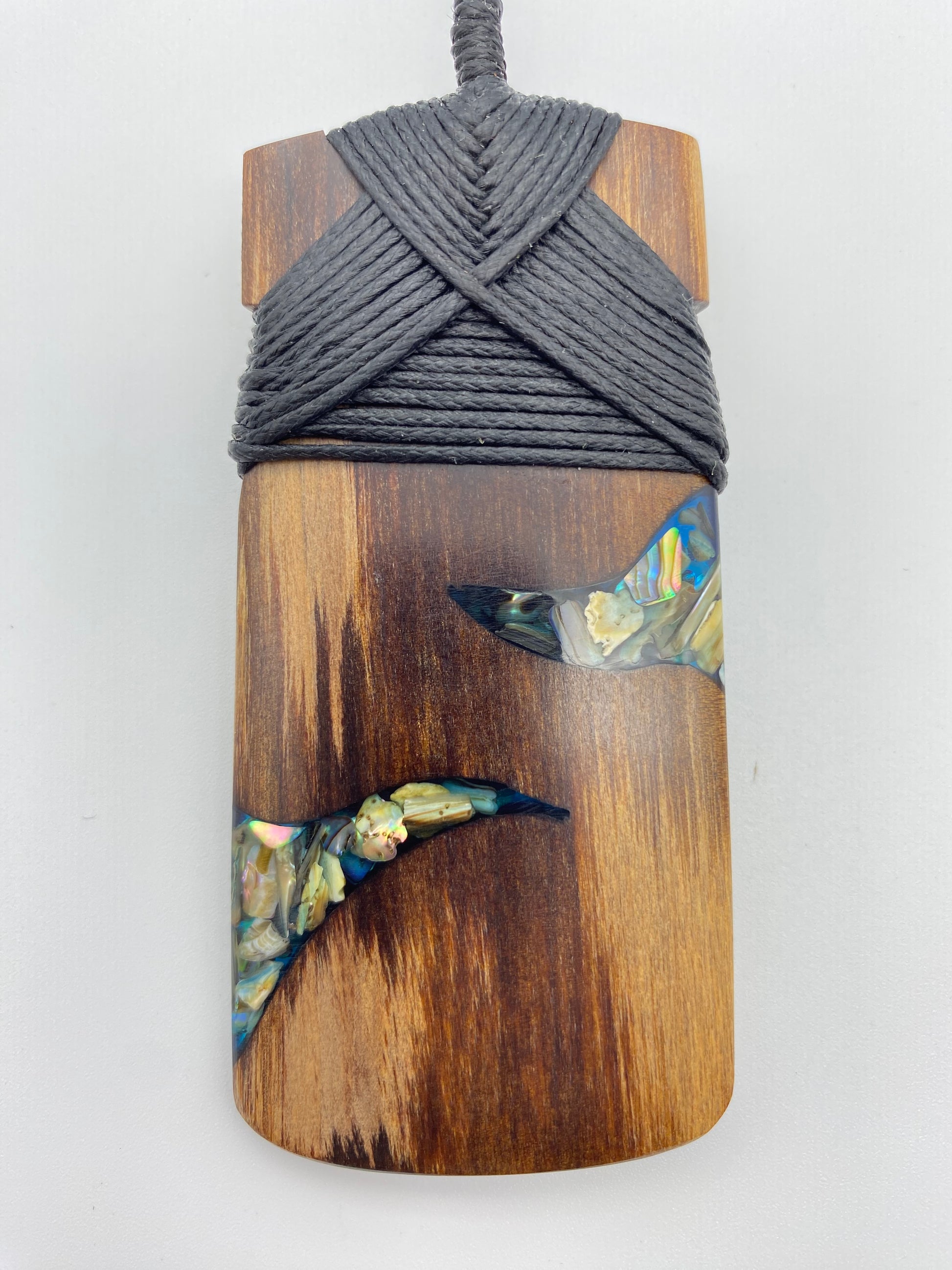 This Toki design has a dark wood framing two triangular resin filled components on each side. It is a beautiful piece that is lashed with black waxed cord. A has two variations on the design that include size and paua.