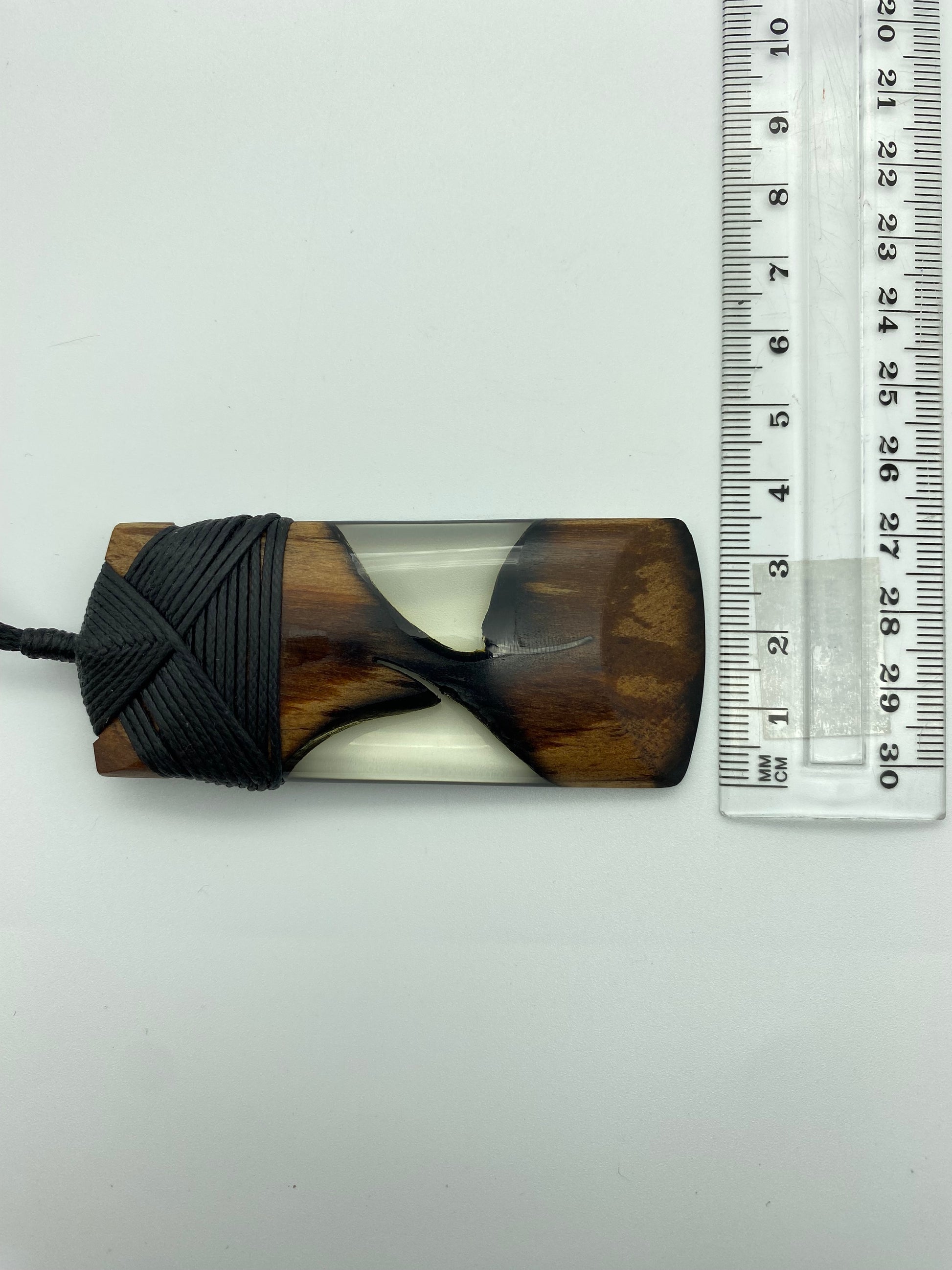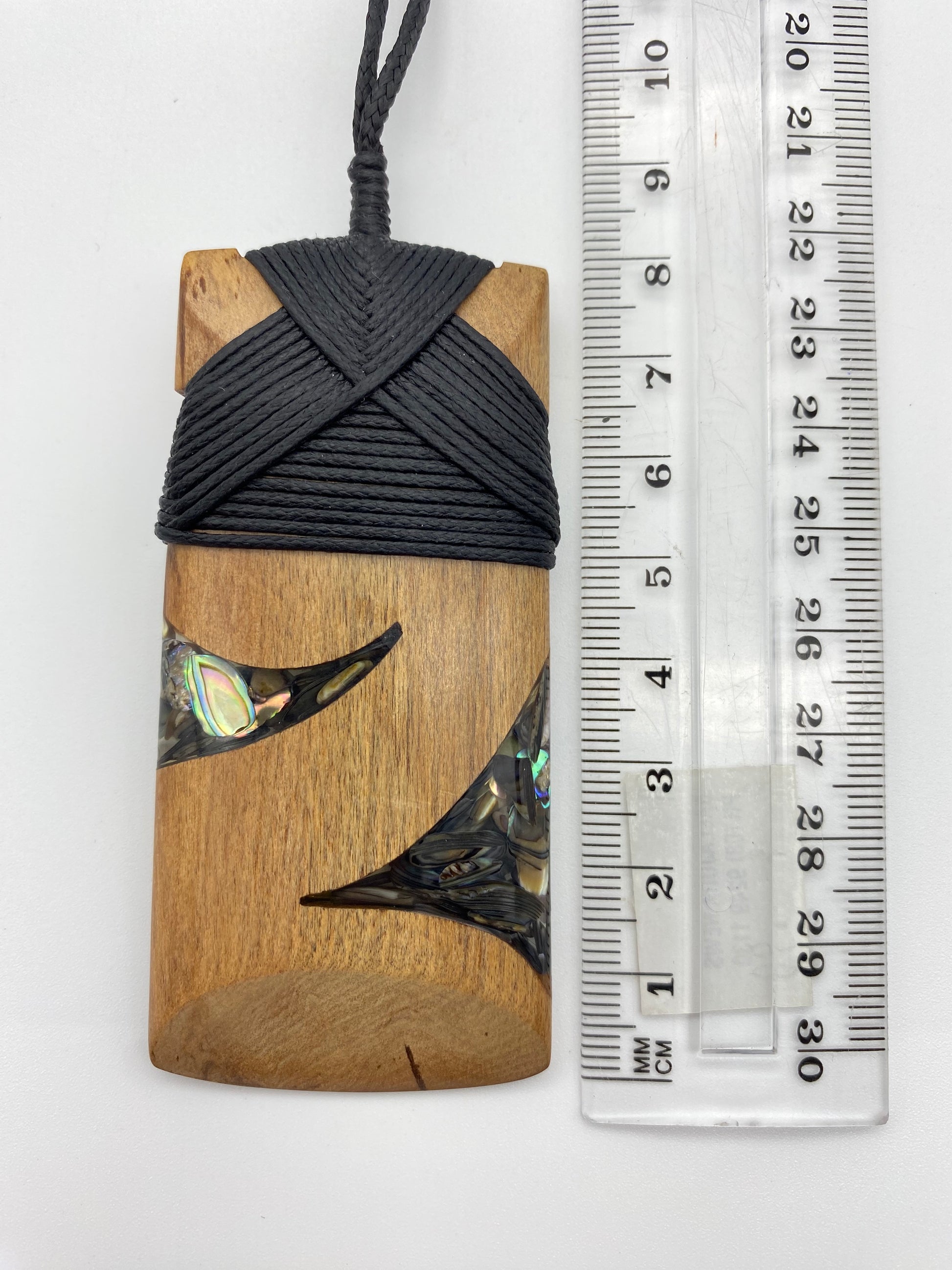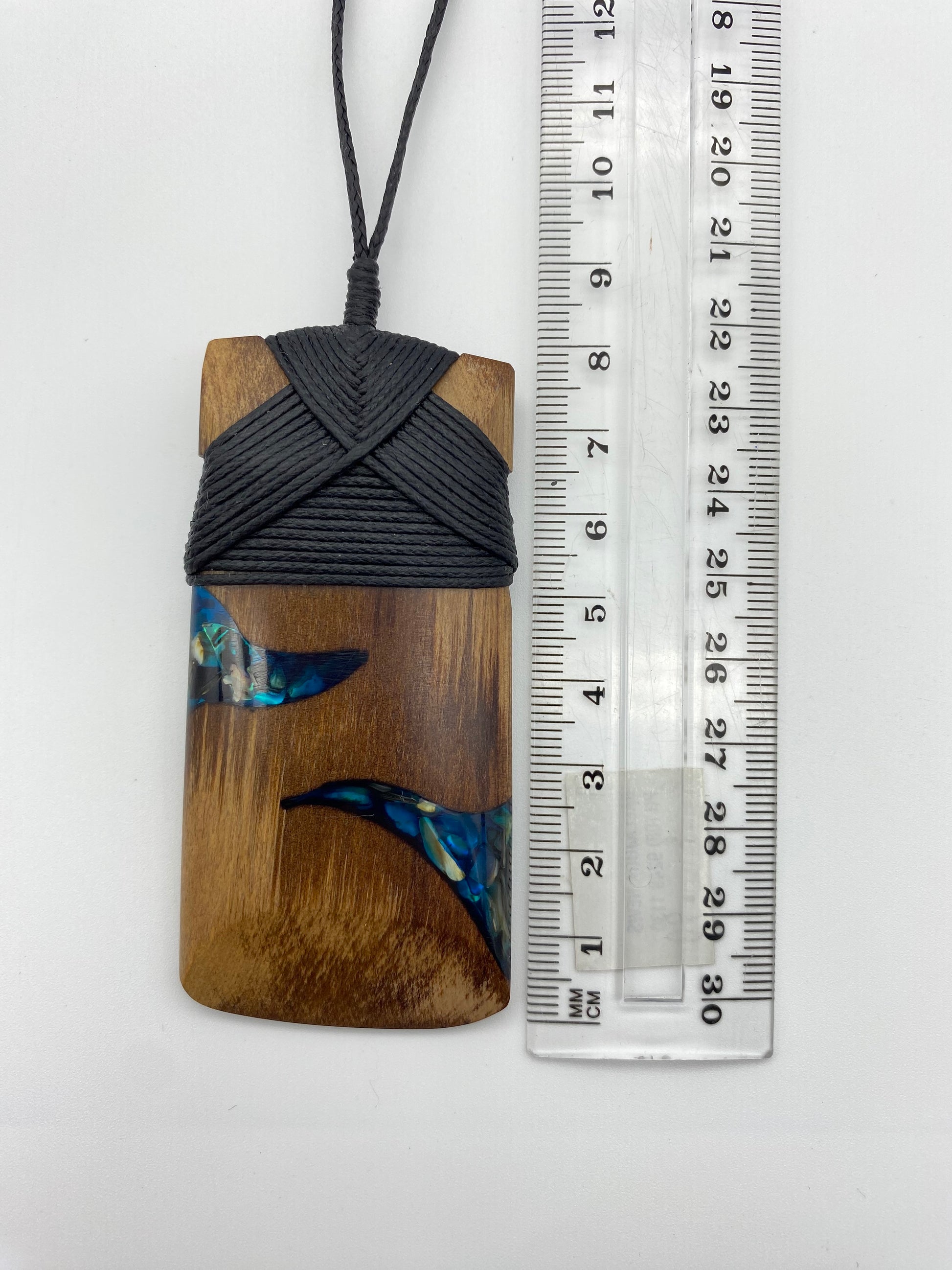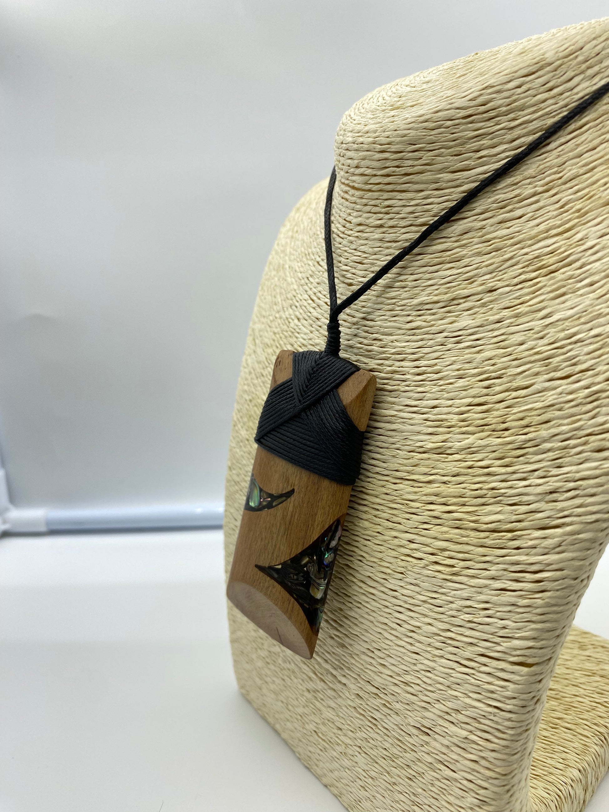 This Toki design has a dark wood framing two triangular resin filled components on each side. It is a beautiful piece that is lashed with black waxed cord. A has two variations on the design that include size and paua.