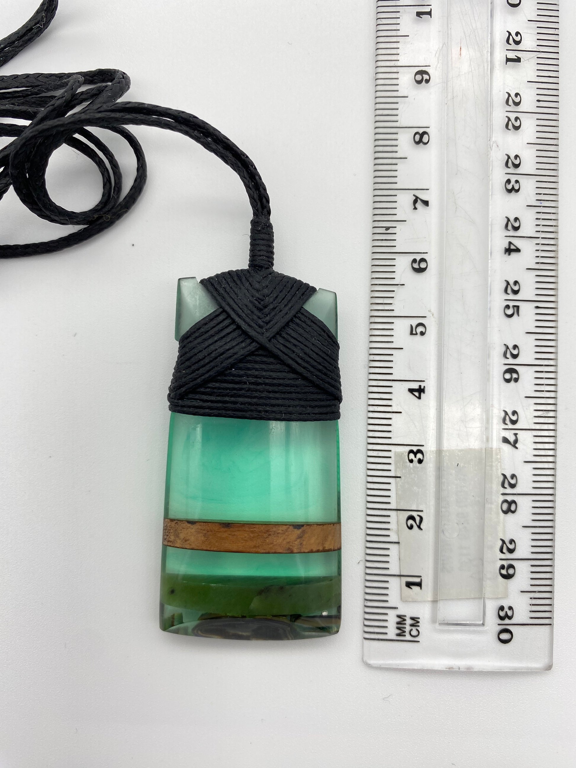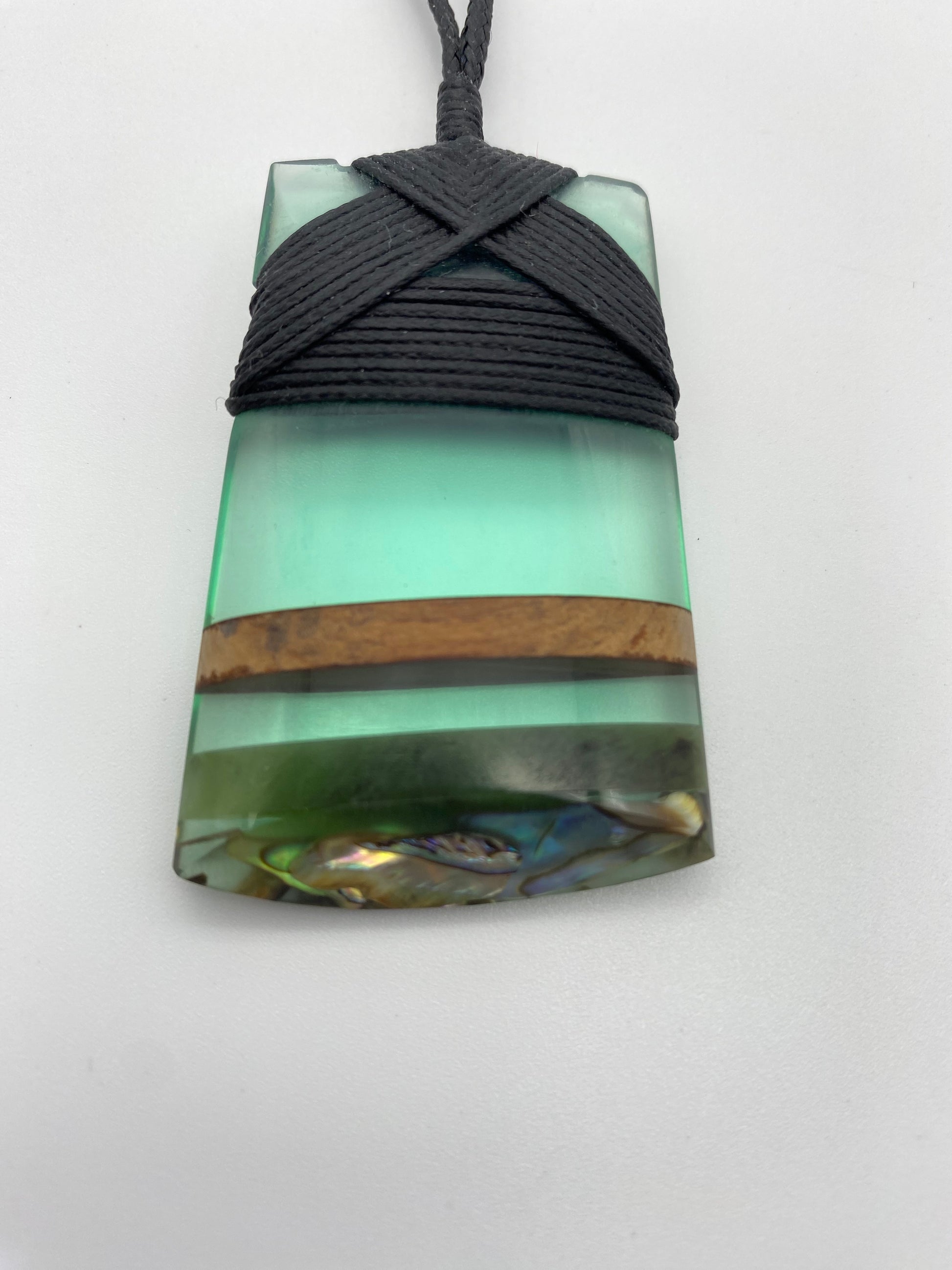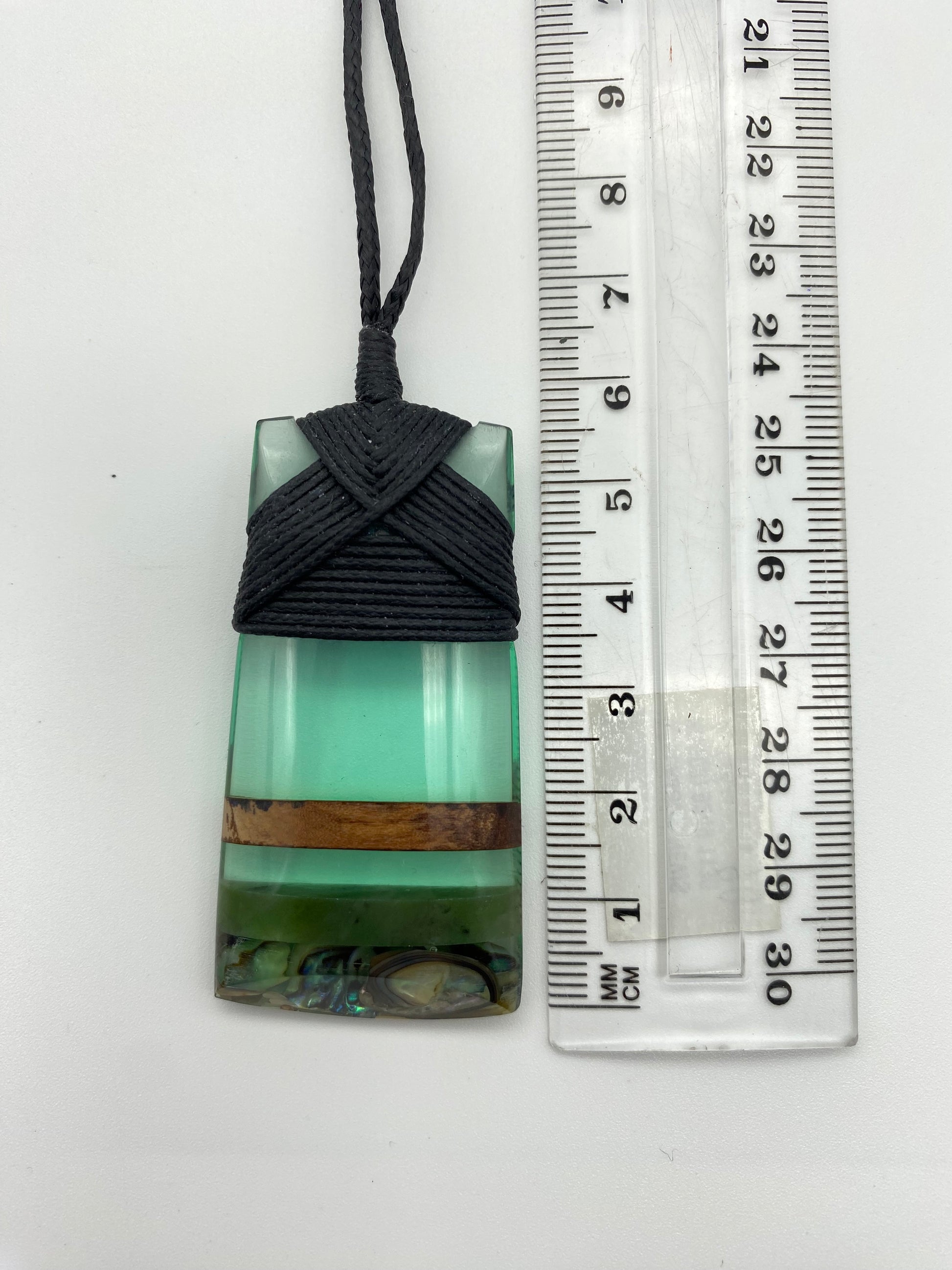 This gorgeous resin Toki design is created with wood, pounamu, and paua set in the coloured resin. The toki is lashed with a black waxed cord which really sets a beautiful contrast on this piece.